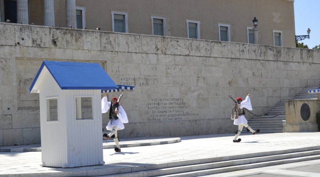 El cambio de guardia en sí que realizan los evzones es como una especie de desfile en el que participan cinco soldados: dos que salen, dos que entran y uno que los dirige. Cuando termina el cambio, otros soldados sin esas vestimentas tradicionales se ocupan de atenderles si es necesario durante la hora entera en la que sólo pueden mover los párpados. Ojo si váis en verano porque el sol que cae es tremendo en la plaza, sin apenas sombra. Me puedo imaginar el calor que pasarán ellos con esas vestimentas.