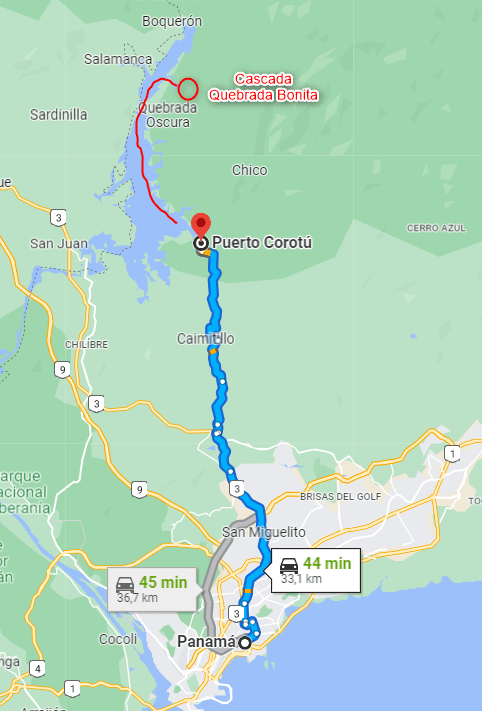 Nos dirigimos en búsqueda del río Chagres al que llegamos con algo de tráfico en aproximadamente una hora. Este es el mapa y el camino que recorrimos desde Ciudad de Panamá por carretera y luego marcado en rojo el que hicimos a continuación remontando el río.