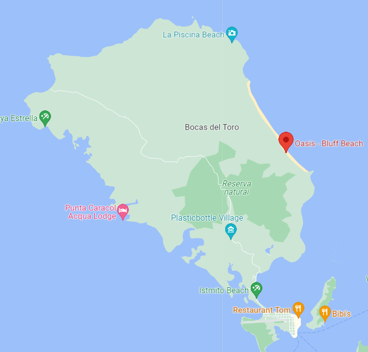 Aquí tenéis en un mapa la situación de la isla, la playa, y el recorrido de la van para llegar a ella desde Bocas.