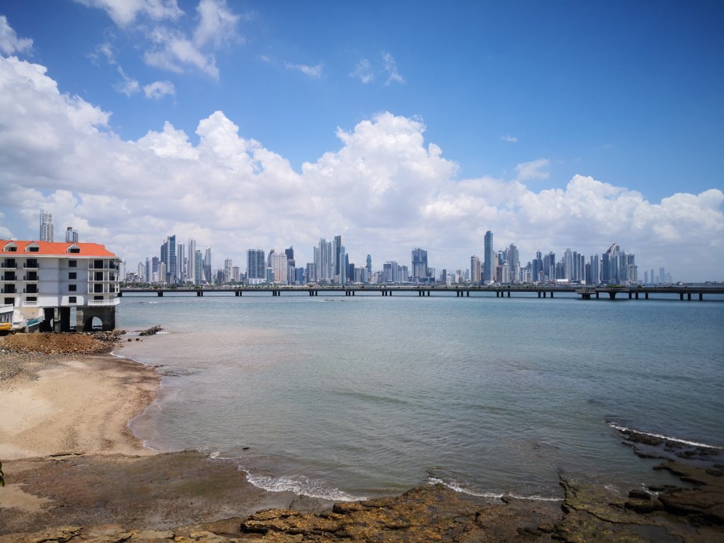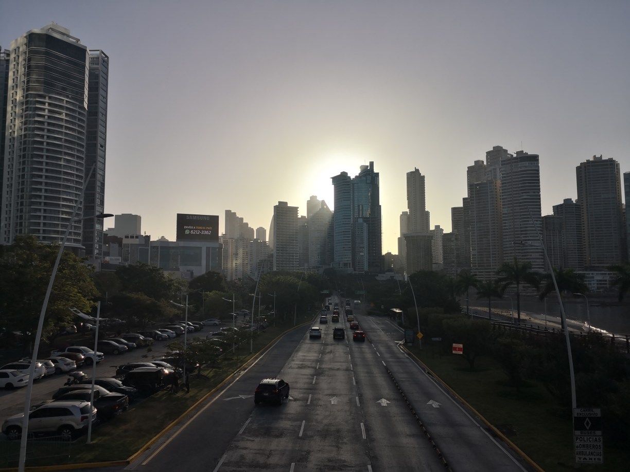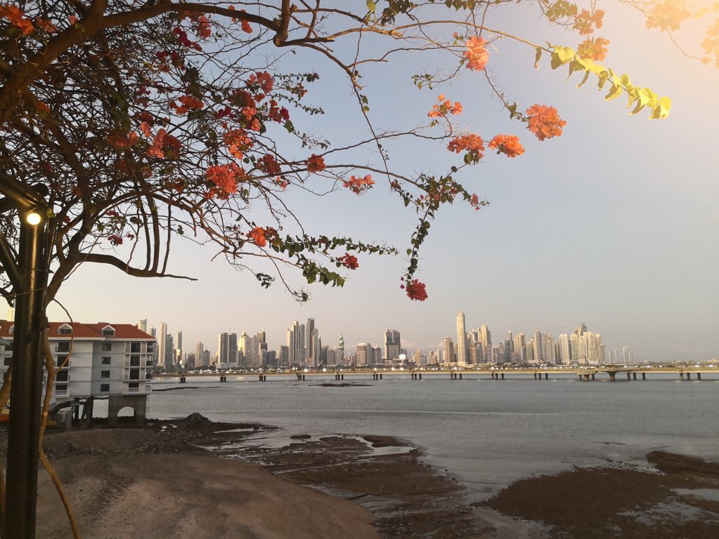 Nos dejaron en el hotel sobre las 17h en medio de una de las habituales tormentas que se generaban por las tardes. Ese día queríamos ver el atardecer en una de las torres más altas de la ciudad. Leímos que el hotel Hard Rock era una buena opción pero estaba cerrado por la pandemia, así que tomamos un UBER (5.14$) para ir al hotel JW Marriot en Punta Paitilla donde se encontraba el bar Panaviera, ubicado en el piso 66, pero al llegar nos dimos cuenta de que estaba nublado por la parte por donde se esconde el sol así que para pagar un precio nada módico por una consumición y no poder ver nada, decidimos no subir, así que dimos un paseo por esa zona que no me pareció muy interesante porque no tiene una salida al mar, la Cinta Costera comienza más al sur.