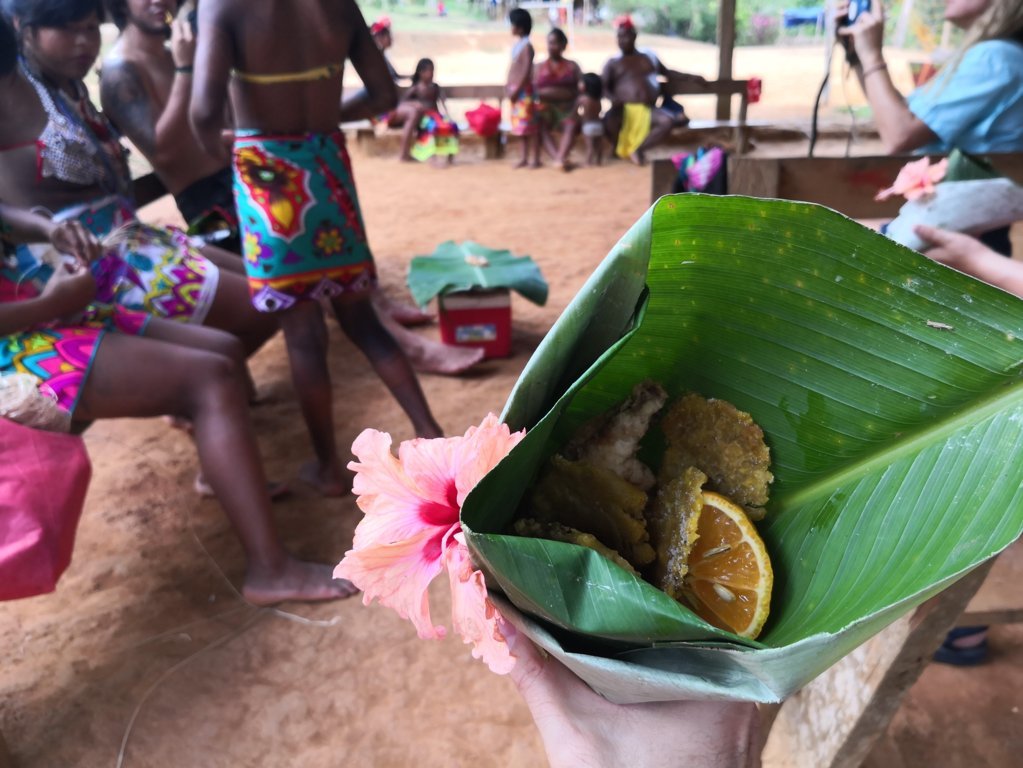 La visita incluía un almuerzo compuesto de pescado frito (tilapia) y patacones, que consiste en plátano frito, y servido en un recipiente de lo más ecológico, ¿no?, la verdad que estaba rico y tanto a Manolo como a mí nos gustó mucho.