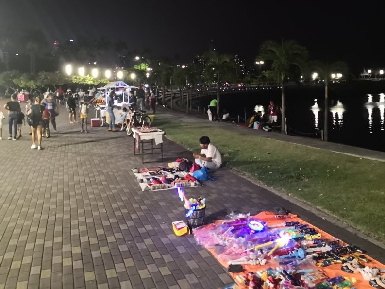 Seguimos caminando hacia la Cinta Costera pasando por el mercado donde había ya mucha gente cenando y llegamos al paseo donde al ser sábado estaba lleno de vendedores ambulantes, puestos de comidas diferentes (el famoso «raspado» panameño) y gente también haciendo deporte.