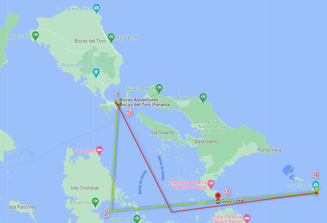 Esta es la ruta que habíamos hecho aproximadamente, con nuestras 3 paradas y el inicio y final en la isla de Colón.
