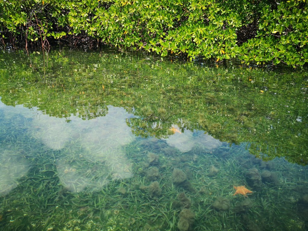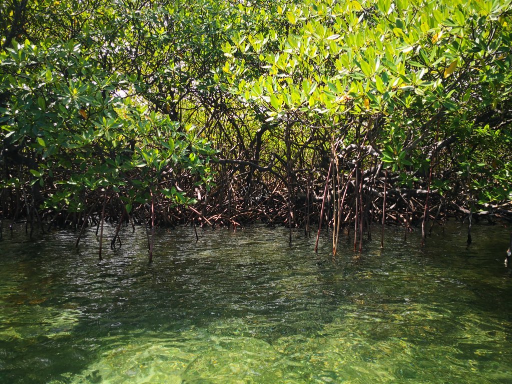 Después de unos 20 minutos y las explicaciones en castellano e inglés del de la agencia que pilotaba la embarcación, tomamos rumbo a una zona de manglares de aguas cristalinas que atravesamos muy despacio.