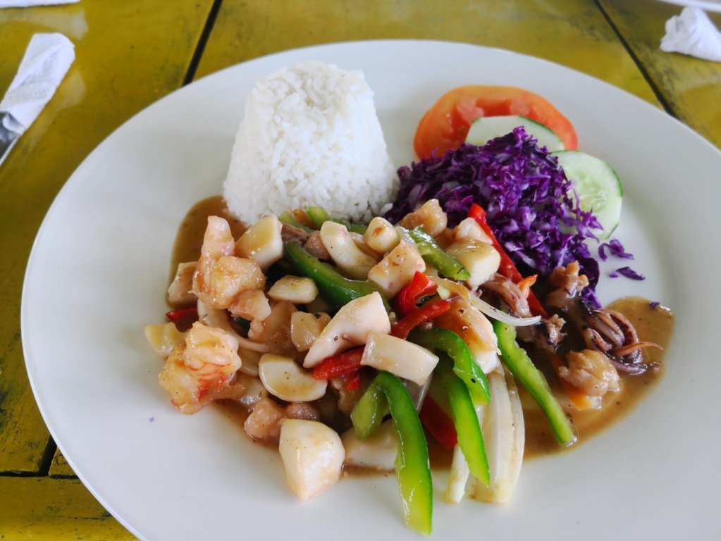 Despúés de unos 30 minutos, nos sentamos para comer. El restaurante lógicamente de barato no tenía nada, 100% dedicado a turistas hambrientos y sin mirar mucho los precios dadas las pocas opciones que había. Nos decantamos por un mixto de marisco al ajillo (que es el que pongo en la foto (18€) y luego unos «deditos de pollo».