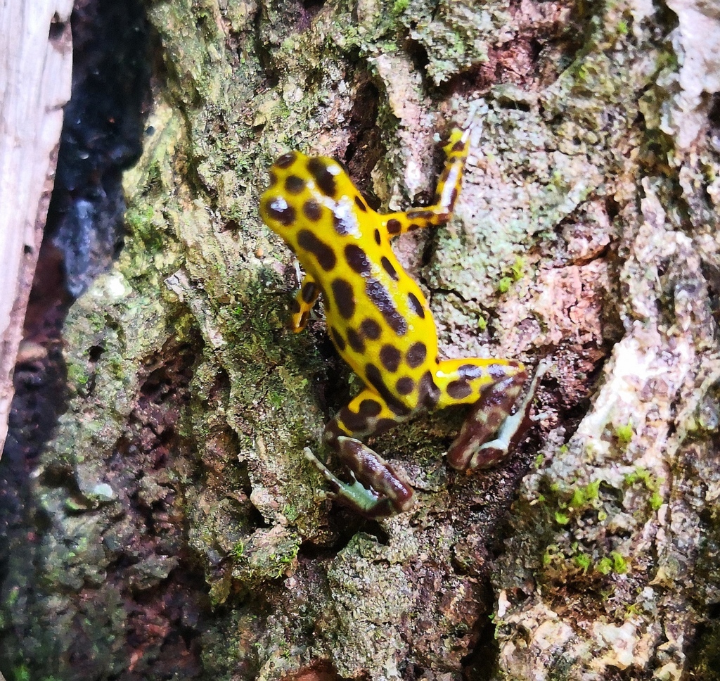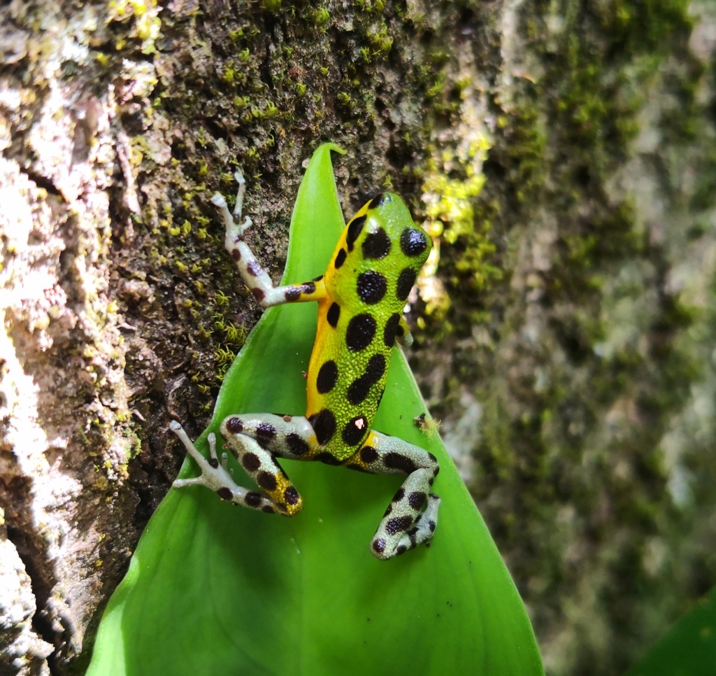 Nuestra guía resultó que realmente en lo que es una experta y en lo que se ha especializado es en el anfibio seguramente más famoso del archipiélago, la que llaman red frog en inglés y en castellano tiene diversos nombres como la rana flecha roja y azul, rana flecha venenosa, rana venenosa de la fresa,… (Oophaga pumilio, designada anteriormente como Dendrobates pumilio). Se puso a buscar alguna para enseñárnosla y enseguida cogió alguna en un bote de plás tico para que la viéramos sin causarles ningún daño. Nos habla de un hecho muy llamativo, y es que esta rana que en la isla Bastimentos es roja, en la isla de Colón sin embargo es verde y amarilla. Nos cuenta un montón de curiosidades de la ranita que la verdad que nos parecieron muy interesantes y amenas.