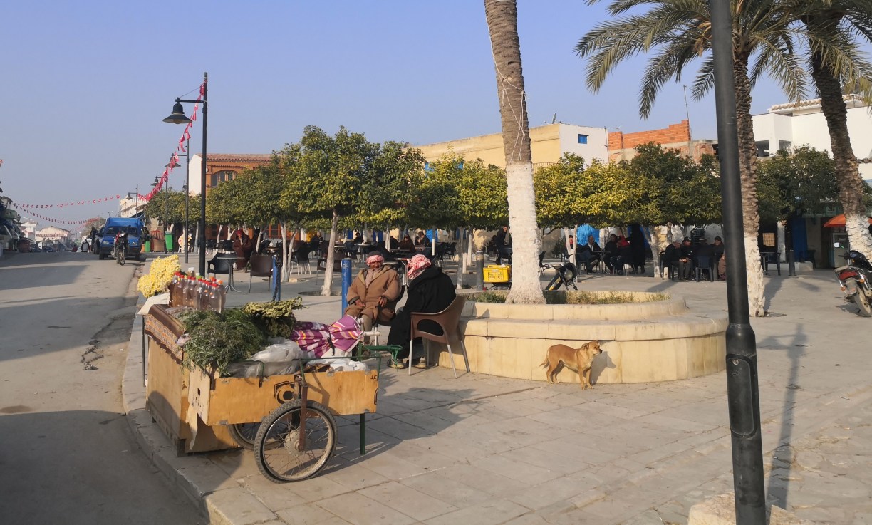 Decidimos en su agradable terraza tomarnos algo para agotar las últimas horas antes de comer. Esta es una plaza ideal para observar a los vendedores ambulantes ofreciendo sus artículos y personajes de todo tipo deambulando. De nuevo cuando pedimos la cuenta, confirmamos que excepto el alcohol, las consumiciones en Túnez en los bares y restaurantes son muy asequibles, más barato que en España incluso en lugares turísticos como este.