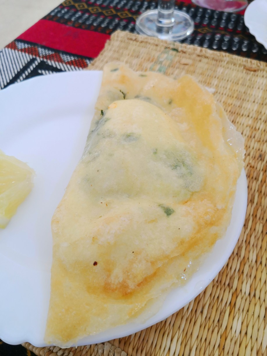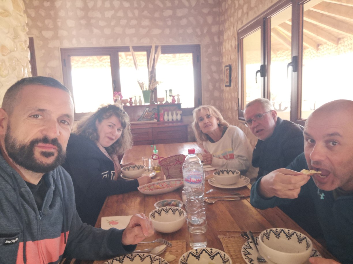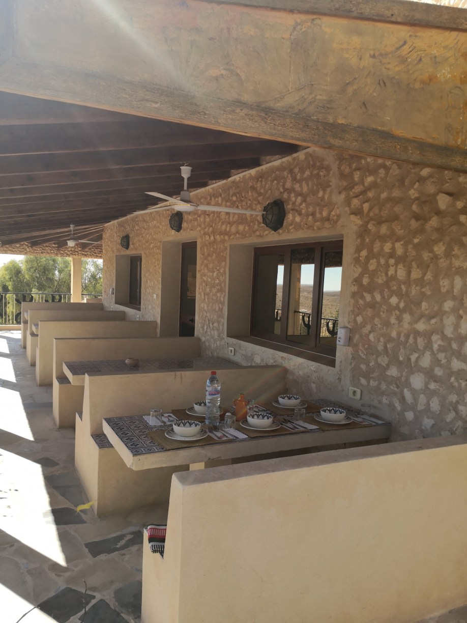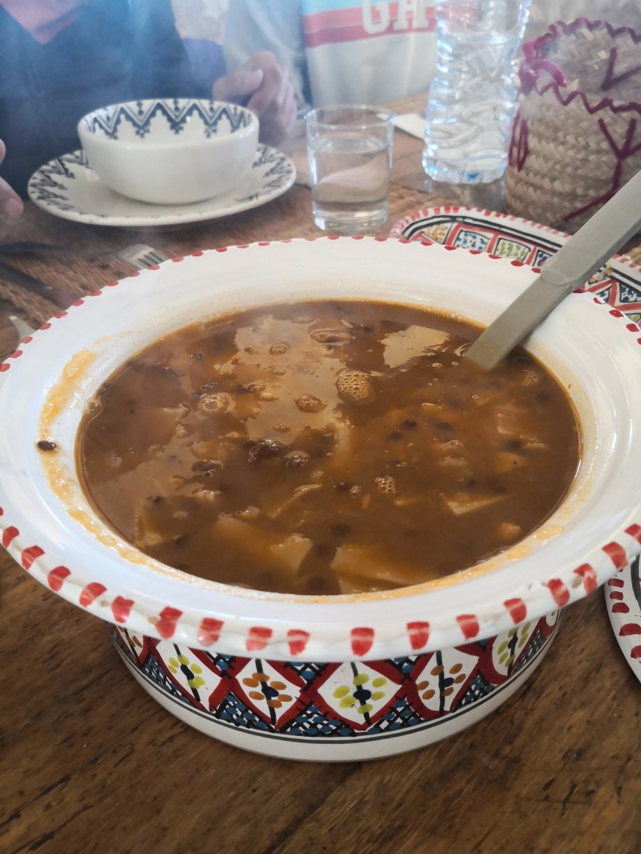 Llegaba la hora de comer y Abderrahman nos llevó a un restaurante en la localidad de Guermassa, llamado Realais Dar Guermassa. Comimos una sopa, como no, que probaríamos muchas veces en este viaje y a mí, sopero por excelencia lo comía encantado, picaba un poco, pero nada exagerado. Luego nos dieron un brik, una especie de empanadilla de queso y huevo, muy buena, y un plato de otro clásico, pollo. Todo muy rico y la verdad que salimos encantados.