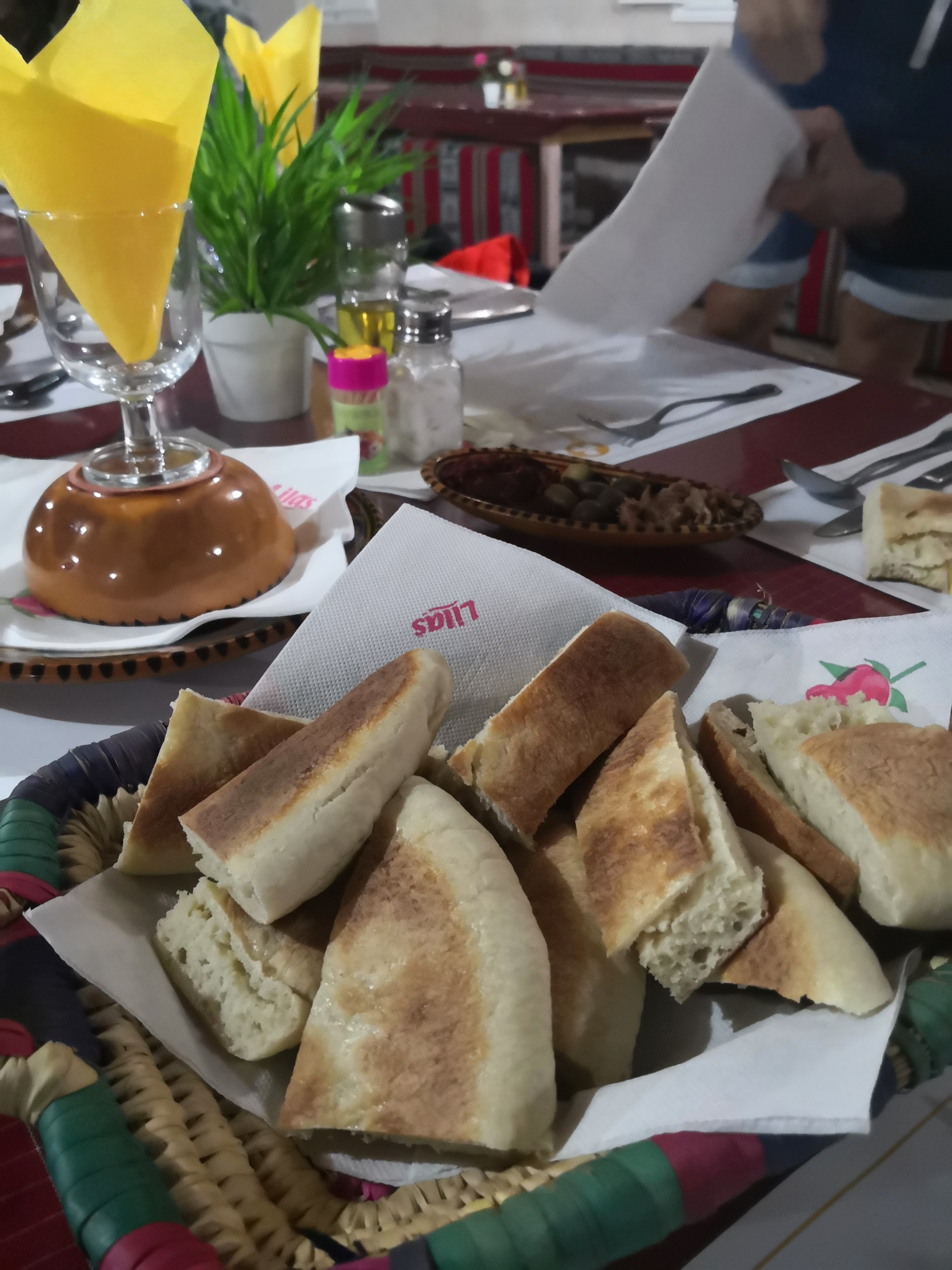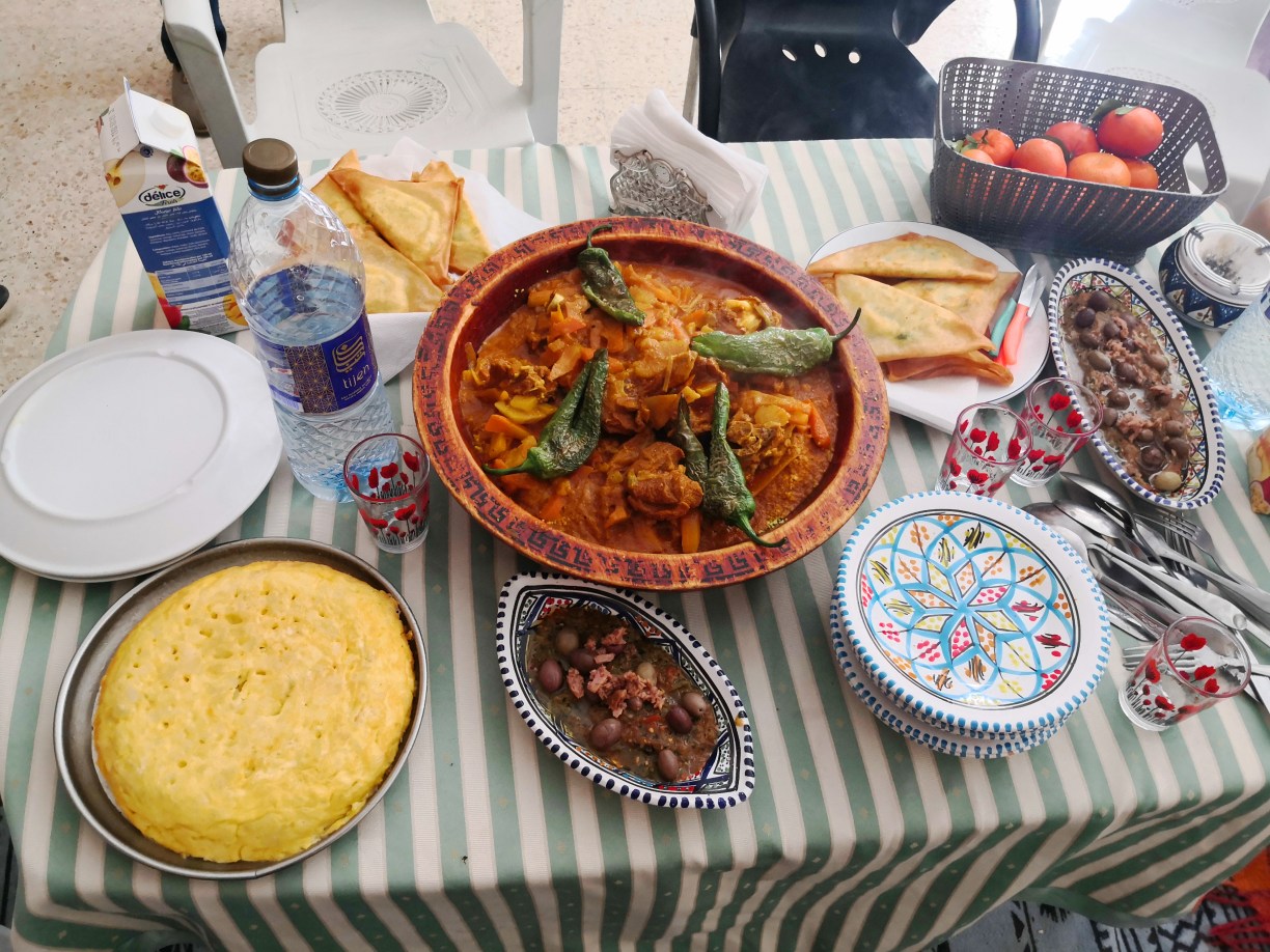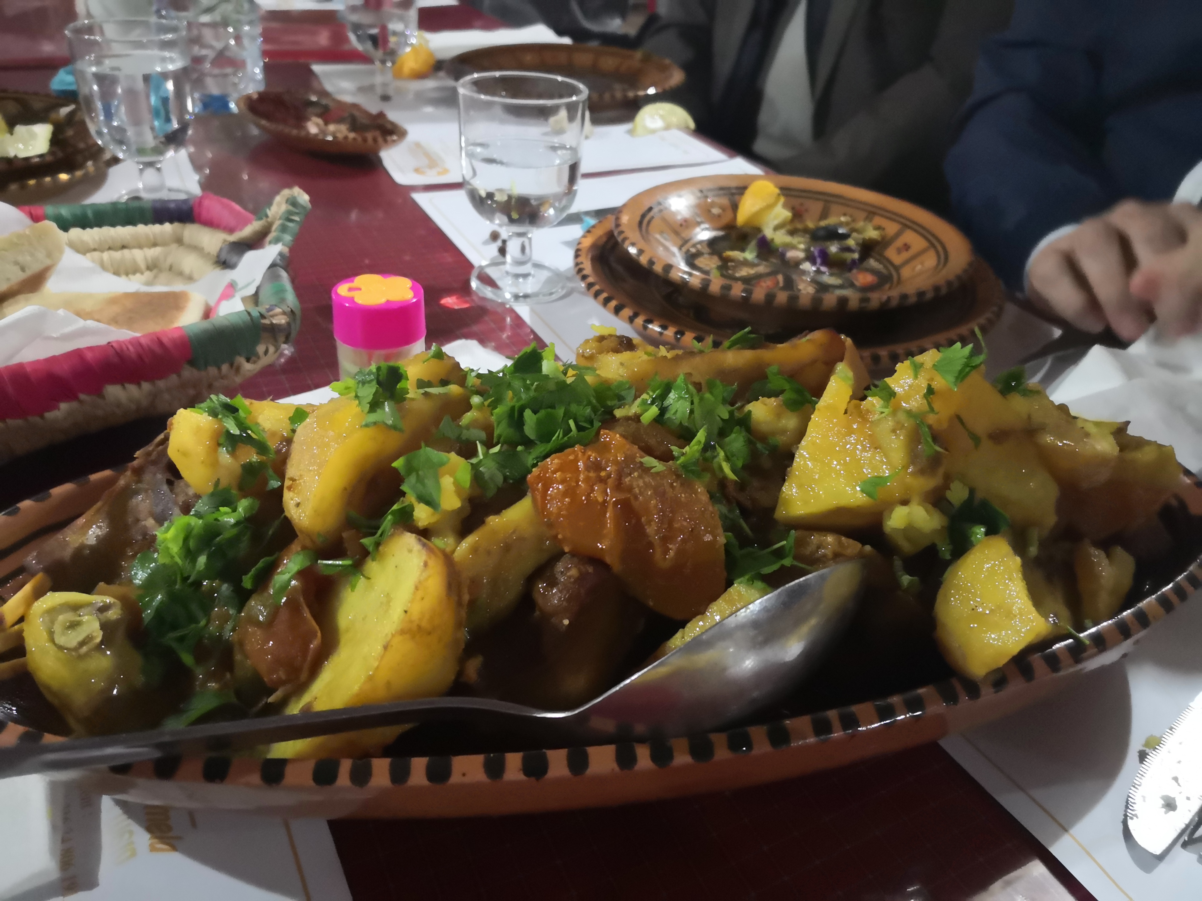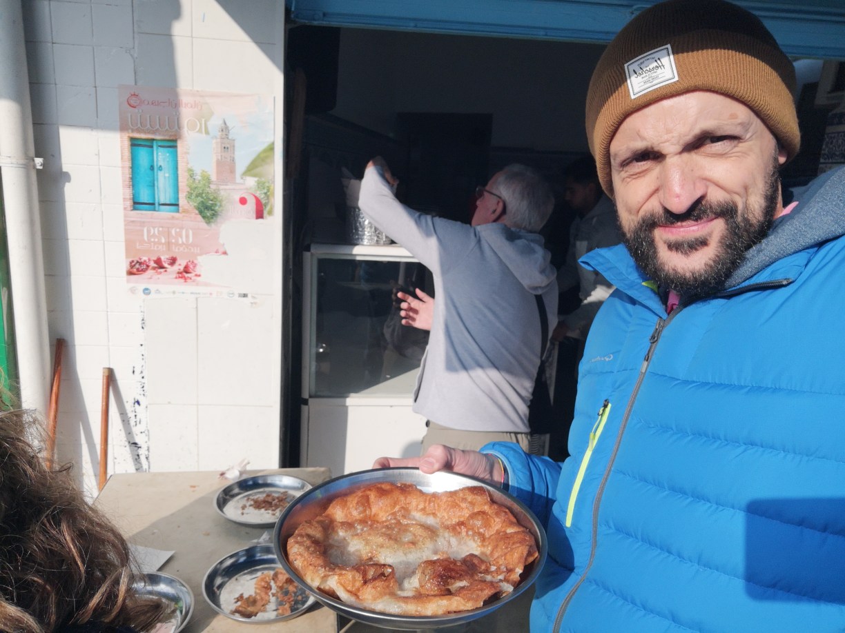Llegaba la hora de comer y Abderrahman nos llevó a un restaurante en la localidad de Guermassa, llamado Realais Dar Guermassa. Comimos una sopa, como no, que probaríamos muchas veces en este viaje y a mí, sopero por excelencia lo comía encantado, picaba un poco, pero nada exagerado. Luego nos dieron un brik, una especie de empanadilla de queso y huevo, muy buena, y un plato de otro clásico, pollo. Todo muy rico y la verdad que salimos encantados.