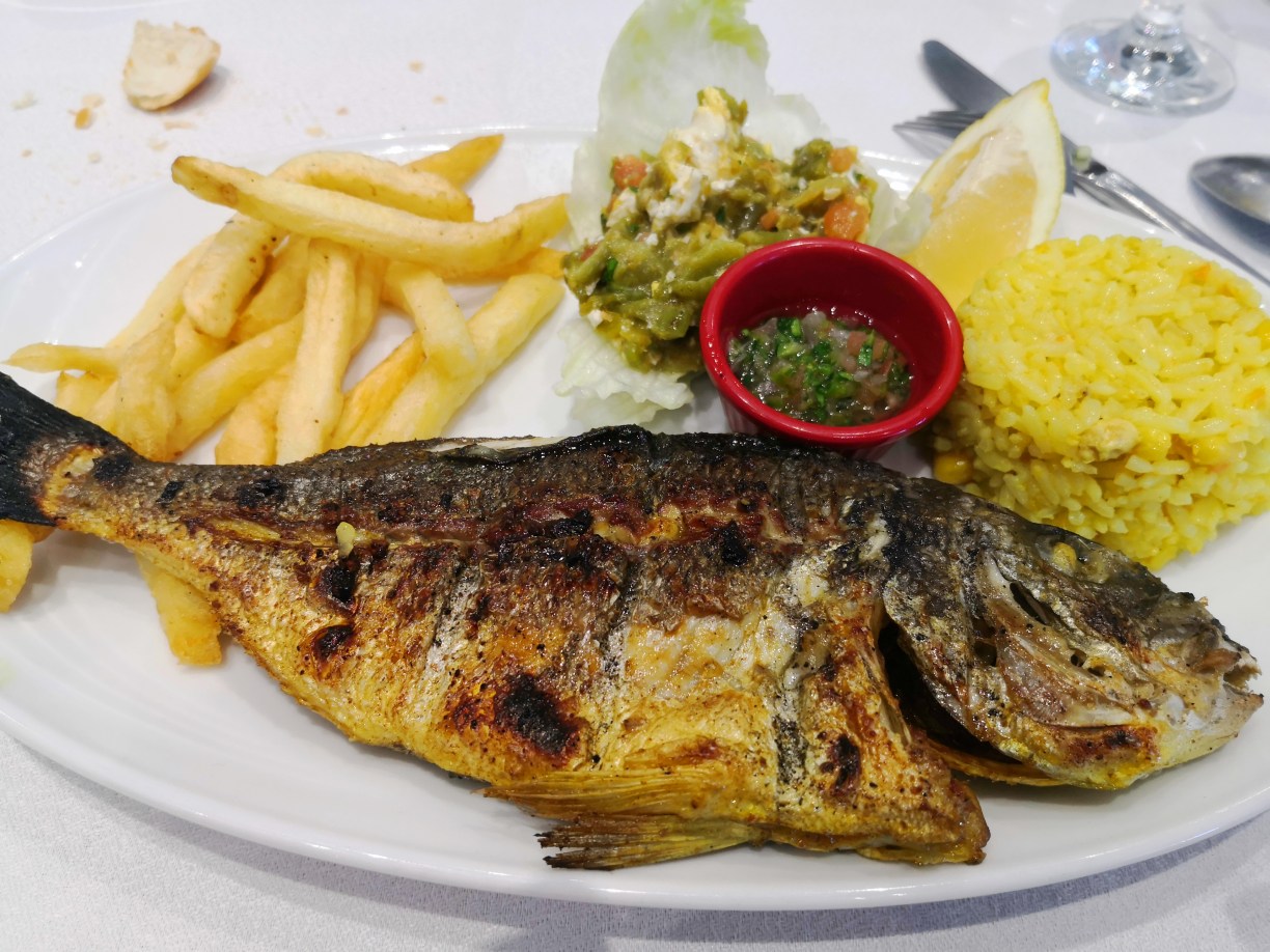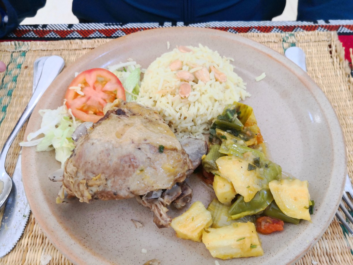 Pedimos lo que se asemeja al menú del día español, con varios platos a elegir y la verdad es que de nuevo comimos muy muy bien. El menú de dos platos abundantes y postre costaba 45 dinares, unos 14€ al cambio en ese momento, nada caro.