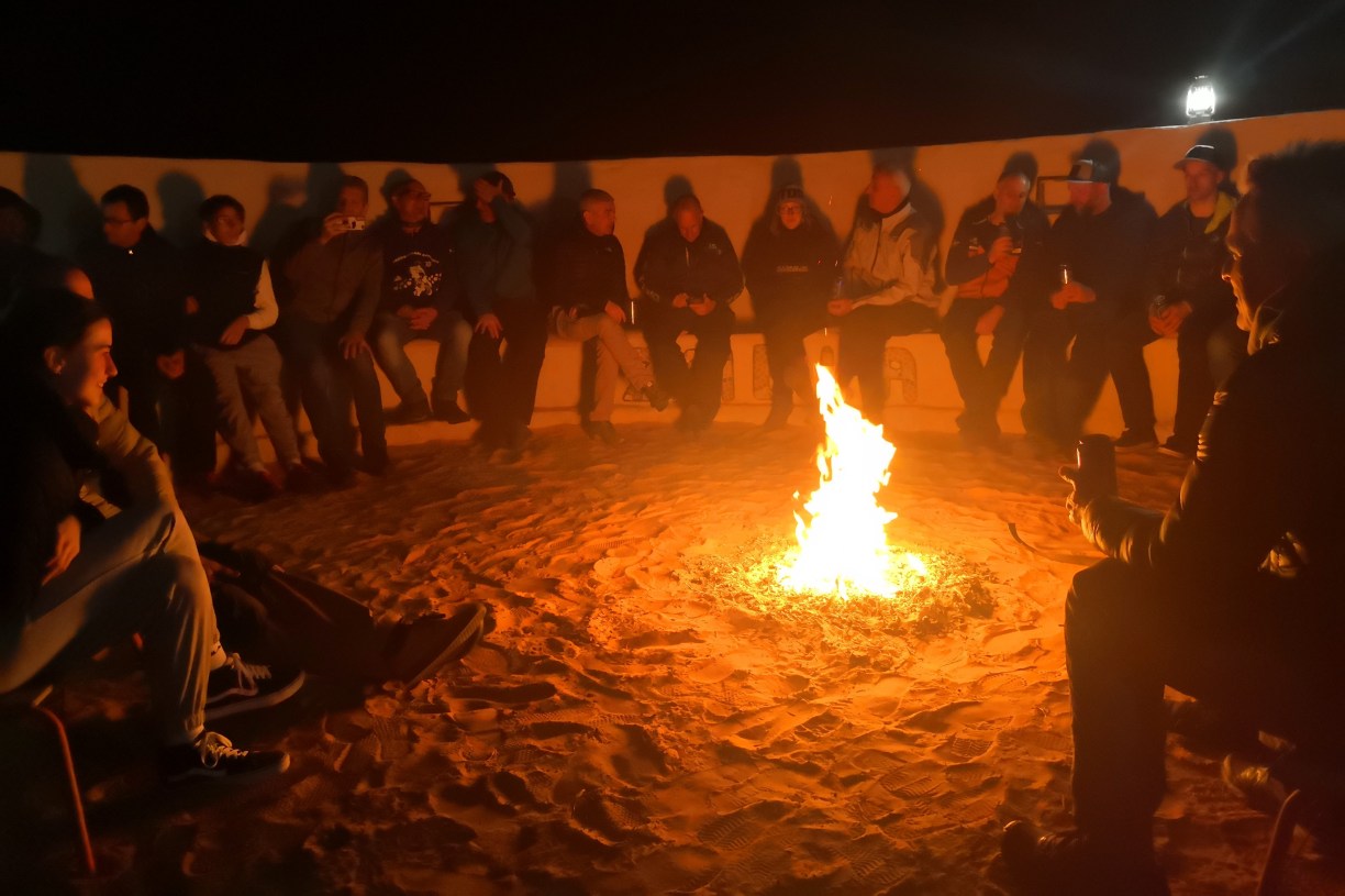 Cuando se fue el sol regresamos al campamento y allí nos sentamos alrededor de un fuego donde un bereber hizo pan horneándolo en las brasas y que luego nos dio a probar a todos. El campamento, este sí, estaba lleno de gente de muchos países, sobre todo europeos de cierta edad en plan raid con coches y motos.