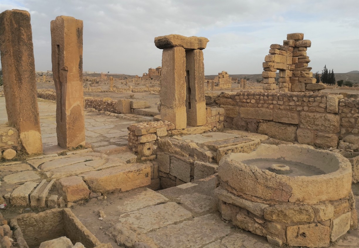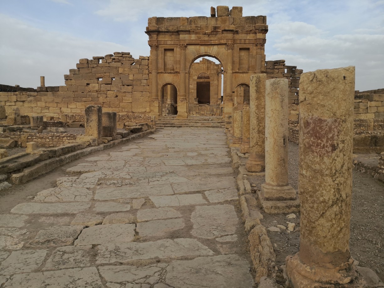 Antes de llegar a nuestro destino final, haríamos concretamente dos paradas para ver interesantes lugares. El primero de ellos era Sbeitla, a unas tres horas de nuestra partida, para visitar otra antigua ciudad romana (también llamada Sufétula) similar a la que vimos el segundo día (Dougga) aunque seguramente no atrae tanto como la primera al estar en un paisaje diferente, al lado de una carretera y no en una ladera con espectaculares vistas como Dougga. Aún así, su estado de conservación es muy bueno y creo que merece mucho la pena. Fue fundada en el siglo I d.C. y alcanzó su máxima prosperidad a finales del III d.C.