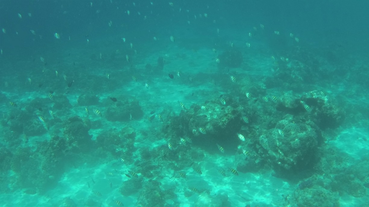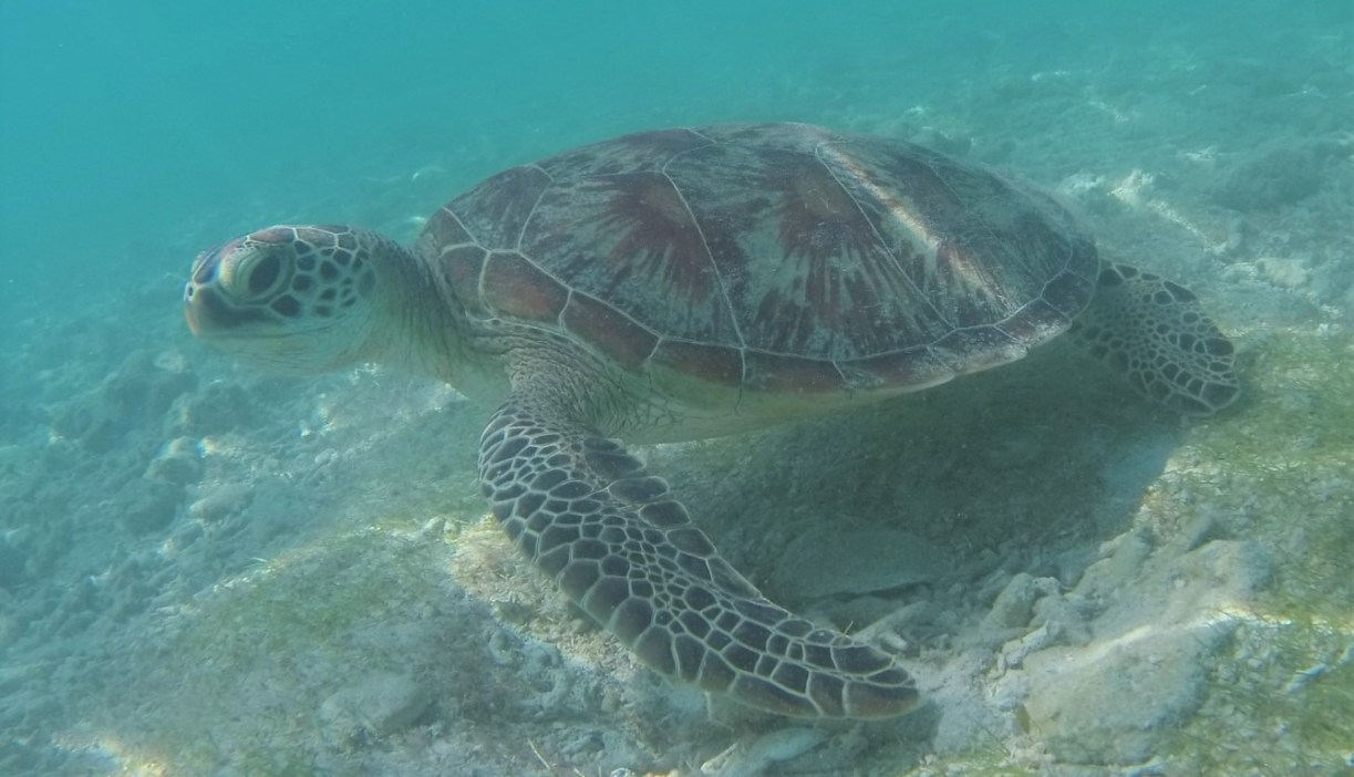 Pero lo mejor de todo es que en esa playa no os aburriréis. Llevamos los equipos de snorkel que nos dejó el hotel y nos metimos en el agua, enseguida vimos grupos de gente y efectivamente ahí estaban las tortugas, alimentándose tranquilamente en el fondo, y lo mejor de todo, a apenas escasos metros de la orilla y a sólo ¡¡un metro de profundidad!!