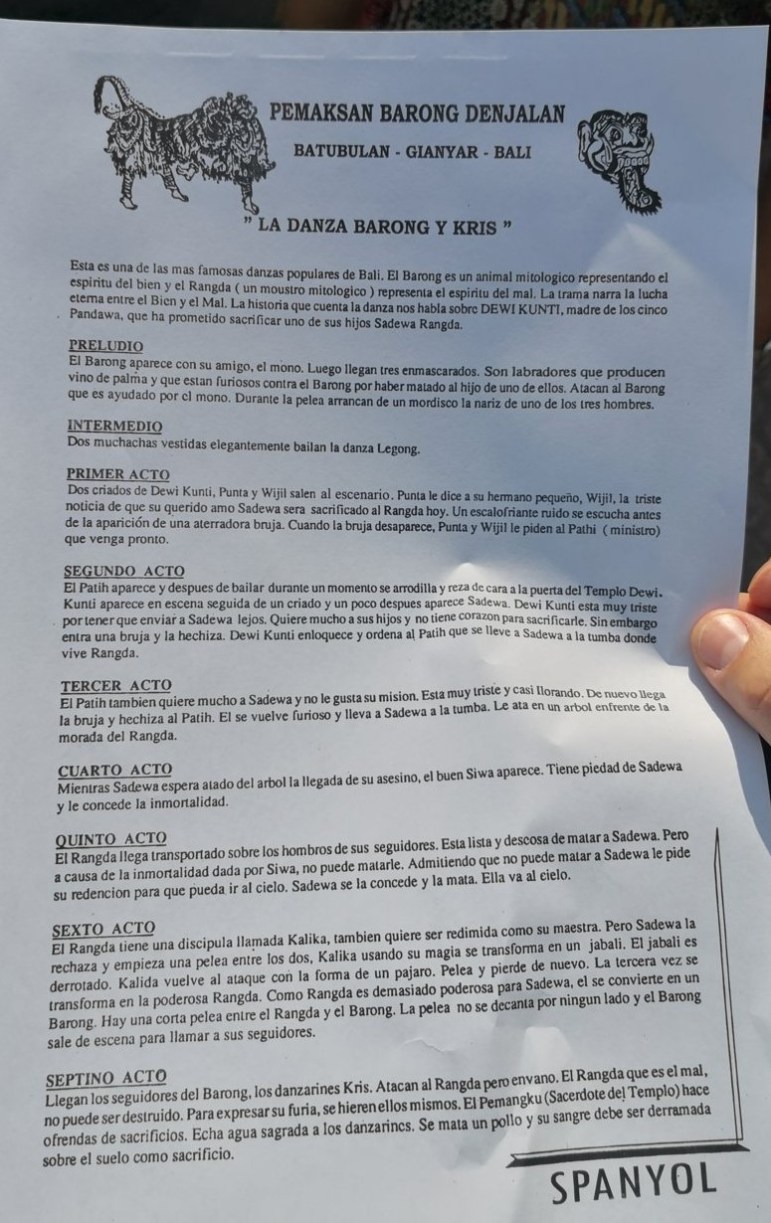 Entramos en una especie de teatro al aire libre con gradas en el que a pesar de lo pronto que era, y estar techado, hacía un calor importante, así que no os olvidéis el abanico. El espectáculo duró como una hora, pagamos 100,000rp (unos 6€) y aunque estos bailes siempre me han parecido que rozan la «turistada» y se me hizo un poco largo no deja de ser una representación de la cultura y tradición balinesa, lo recomiendo.