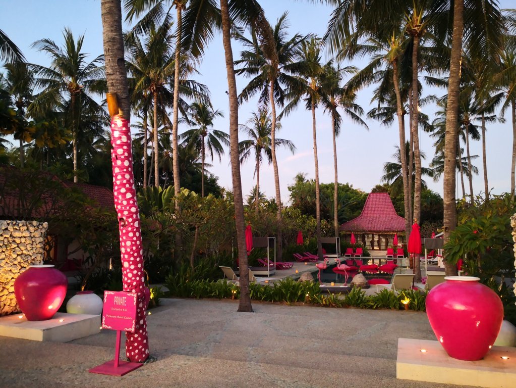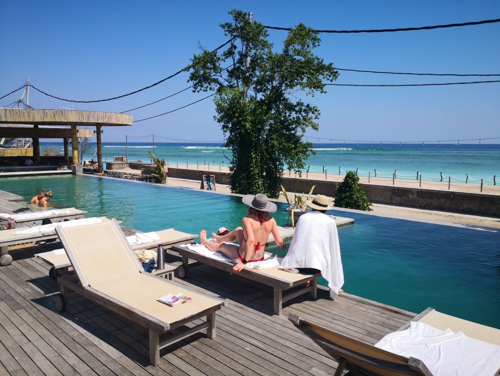 Volvimos al hotel y seguimos el protocolo de todos los días, salir a ver el atardecer. Fuimos a un bar que habíamos visto ya en Trawangan y que es fácil recordar porque es todo rosa, Pinkcoco. Un resort que yo creo que es de lo mejor que vimos en la isla y que por tanto recomiendo, una pena no haber escogido este para nosotros porque estaba aproximadamente al mismo precio que el nuestro y con buen ambiente.