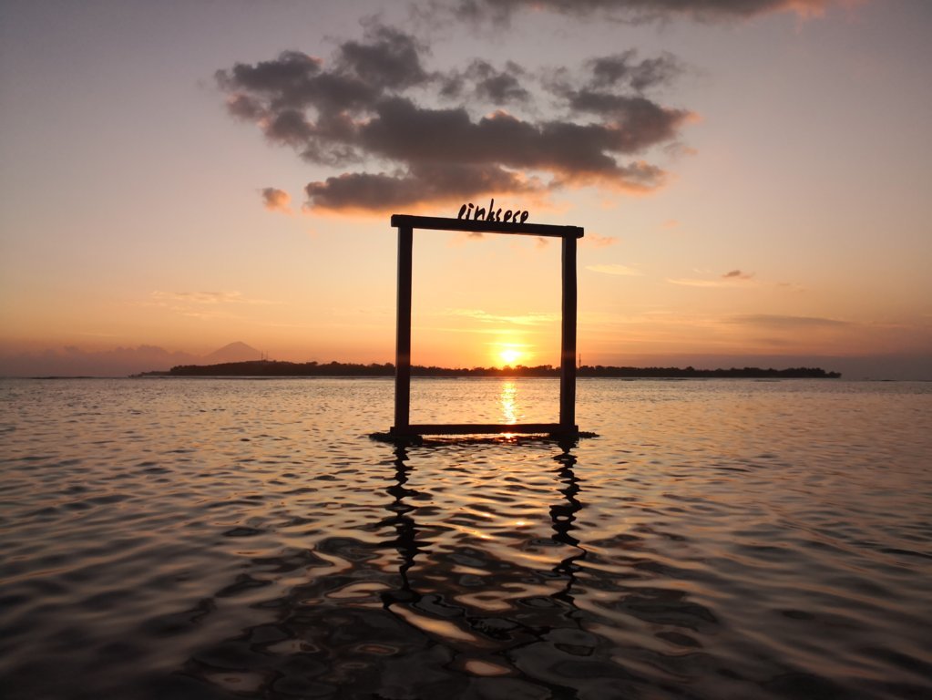 Me encontré una isla mucho más rural y menos explotada y en general me gustó menos. Había muchos más tramos de arena con lo que la vuelta se hizo larga y pesada, tanto que llegó la puesta de sol y me encontré con un precioso atardecer coincidiendo con un grupo de niños bañándose divertidos y que me saludaron para la foto. He de decir que al menos estos me gustaron más que los de Trawangan, con Gili Meno en el horizonte.