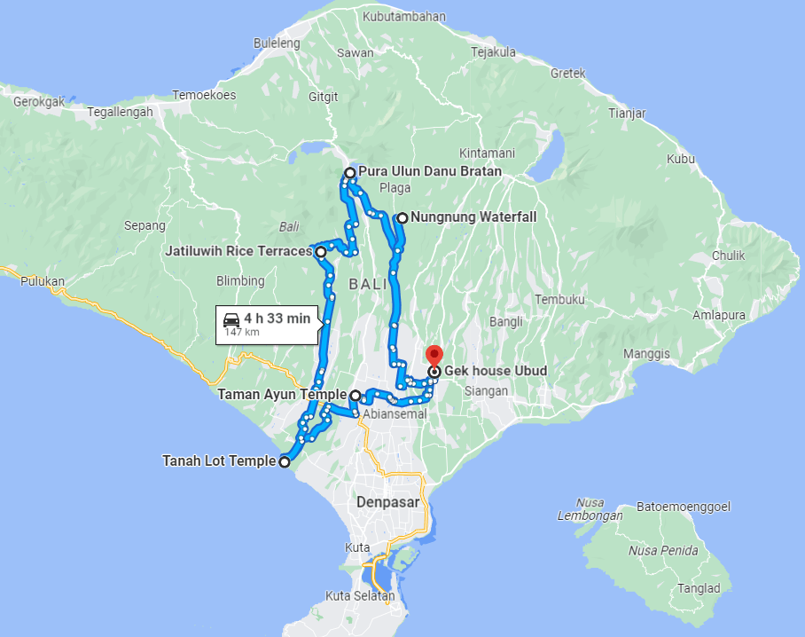 Dividimos los 3 días con ellos en rutas por el noreste de Ubud el primer día, zona central el segundo y dejamos el viaje más largo hacia el este llegando hasta Lempuyang para el cuarto día. Planificar bien la ruta y no querráis ver todo, es mejor poco y bien que mucho a toda prisa. Templos hay más de 10,000 en Bali y no me parece ni lógico querer ver los más posibles, al final, quitando los más famosos y originales, el resto son parecidos.