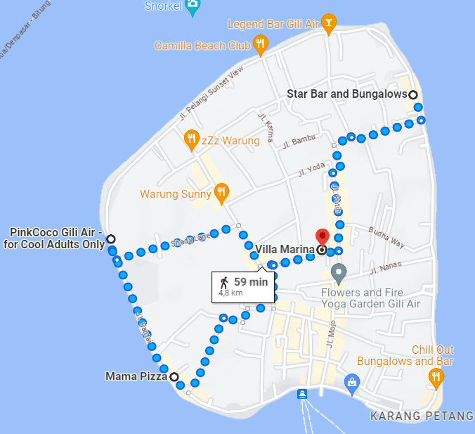 Mientras Claudia descansaba, yo, como hice en Trawangan, me fui a dar una vuelta alrededor de la isla para echar un vistazo rápido. Se tarda menos porque esta es más pequeña que aquella.