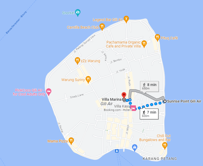 En esta isla la zona más bulliciosa (por decir algo) del «centro» está al sur, junto a la zona de la llegada de los barcos. Es apenas una calle con algunas tiendas y unos pocos restaurantes, nada que ver con Trawangan.