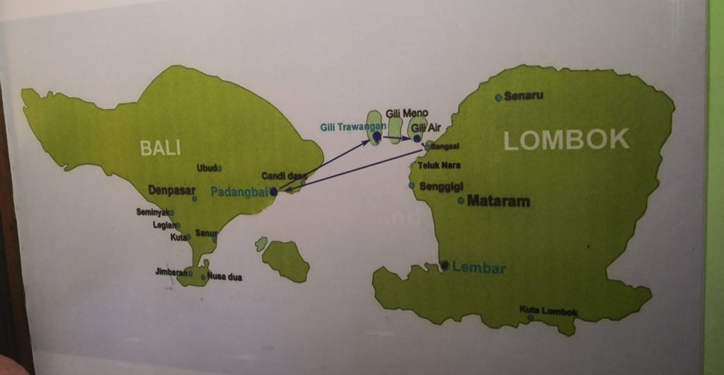 Con bastante calor y con algo de retraso llegó nuestro Fast Boat (de la compañía Goldenqueen). Recordamos el plancentero viaje de ida subidos en la borda pero en este no era posible así que tuvimos que pasarlo sentado. Había máquinas de aire acondicionado, pero no enfriaban lo suficiente y además había que cerrar las ventanas porque entraba el agua, así que pasamos un viaje horrible de calor, vimos gente sudando, mareada… menos la que estaba a mi lado que estaba con sudadera!! 🤪. De verdad, el viaje, esperpéntico, no puedo entender que no haya una climatización decente. Menos mal al abanico que habíamos comprado a un ancianito que nos había dado pena en Ubud.