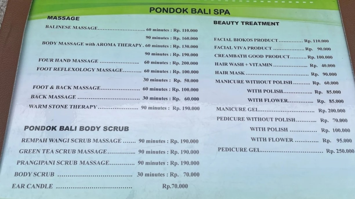 Por el camino, y dado que el día anterior habíamos visto un spa junto al restaurante en el que cenamos y vimos que tenía buenas críticas en Google, le enviamos un whatsapp para una sesión esa misma noche. Se llama Pondok Bali Spa. Veréis por todas partes lugares de masajes, hay más lujosos y que pueden llegar a los 40-50€ por sesión, pero luego otros cientos mucho más baratos. Hay que andar con atención porque vimos cada sitio que tenía pinta de no haber mucha limpieza así que fiaros de las recomendaciones o de las opiones de otros. La verdad que con este sitio acertamos. Aquí están sus precios, nos dimos el masaje balinés de 60 minutos y fue estupendo, más que estupendo, y todo ¡¡por menos de siete euros!!! Primero te lavan los pies, luego te dan ropa interior de un sólo uso y te tumban en la típica camilla. Es un masaje de todo el cuerpo que te deja más que relajado. A mí me lo dio una chica con unas manos fuertes y maravillosas, se llamaba Coman, y el de este día no sería el último.