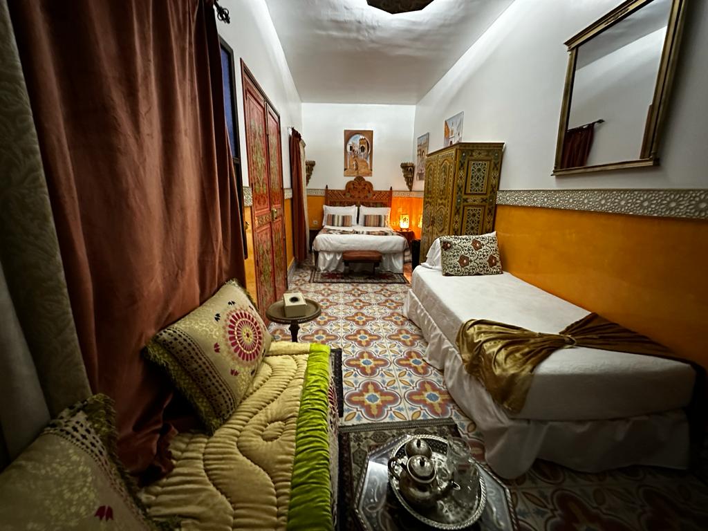 Tuvimos que dejar el coche a las afueras de la ciudad e hicimos el resto del camino caminando. Nuestro alojamiento estaba en el centro de la medina, en una ubicación óptima. Se llama Casa Sabila y consta de un patio interior y con pocas habitaciones en total pero muy bonitas como podéis apreciar.