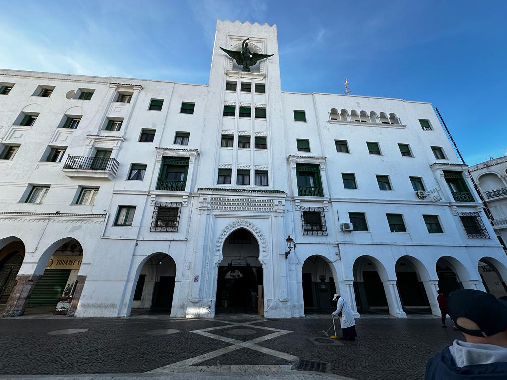 Nuestro guía, que ya percibimos que no es el mejor del mundo porque nos da explicaciones muy escuetas, nos lleva por el barrio de Mssalla Kdim, en las afueras del famoso distrito del Ensanche, donde se encuentran la mayoría de los edificios históricos realizados durante la etapa del Protectorado español. Encontramos por ejemplo el espectacular Instituto Cervantes o el Teatro Nacional, construido en 1914 y que fue conocido como teatro Victoria hasta los años 30. Vemos también el pasaje Benarroch, el Casino Español y el cine Avenida, todo vestigios de la huella que dejó nuestro país en Tetuán.