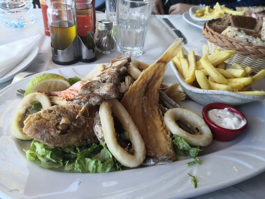 Decidimos aparcar y comer en un restaurante de lo más turístico, de nombre no muy original Cap Spartel. Elegimos una mesa junto a la ventana con buenas vistas y pedimos una mini ensalada, un par de frituras de pescado y un filete de pollo empanado. Con una botella de agua y sin postre, pagamos 561 dirhams (unos 51€), el precio más caro que pagaríamos por comer en todo nuestro viaje. La verdad que la comida no me entusiasmó, sobre todo la fritura no me pareció fresca, todo congelado, pero es lo que tiene los lugares 100% turísticos, no lo recomiendo.