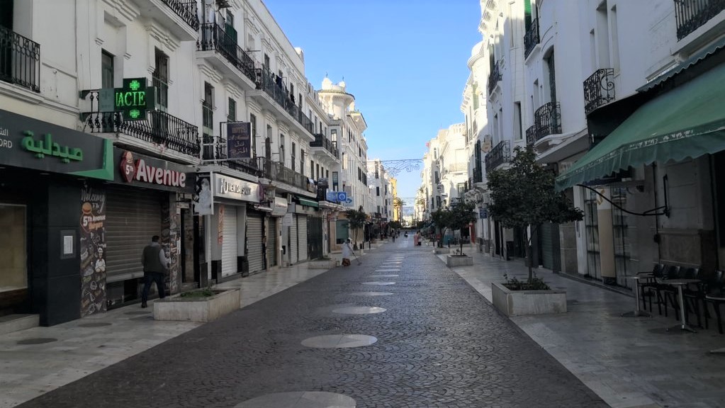 Aquí la gente nos queda claro que no madruga mucho y las calles estaban vacías, sobre todo la calle comercial por antonomasia de esta zona, la avenida Mohamed V (que llegó a llamarse del Generalísimo). Caminando por ella efectivamente se ve enseguida la influencia española tanto de la arquitectura como incluso los nombres de los comercios y los letreros, muchos de ellos en castellano.