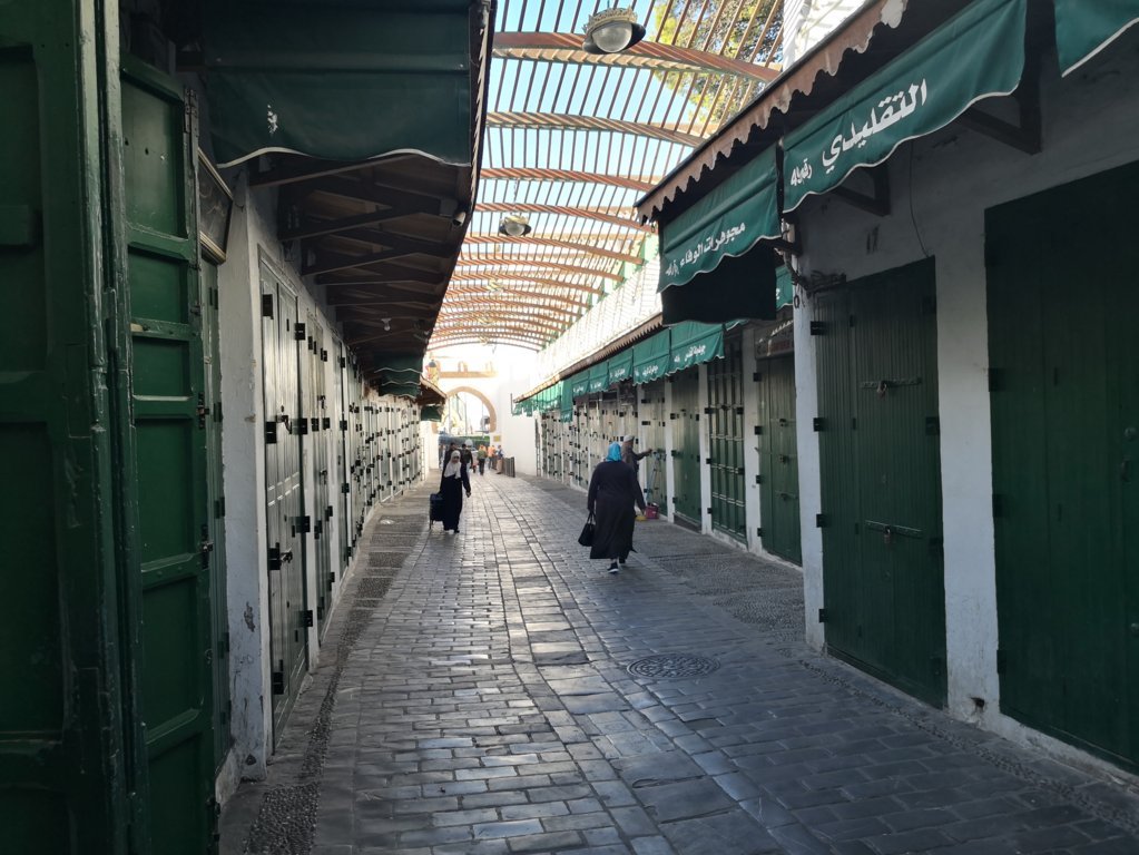 De nuevo volvimos a entrar en la medina por la puerta que se encuentra está junto al Palacio Real, llamada Bab Ruwah y que es más reciente. Nos seguía sorprendiendo que eran más de las 10 y media de la mañana y algunas calles de comercios siguen sin abrirse, esta es la de las joyerías.