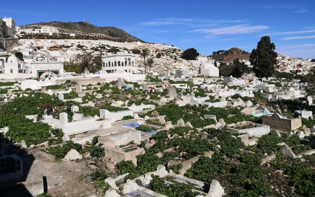 Subimos hacia el monte Dersa y nos apeamos junto a un descampado para tener otra amplia perspectiva de la ciudad, viendo en primer término el gigantesco cementerio musulmán y junto a él, un pequeño, comparado con el primero, cementario cristiano.