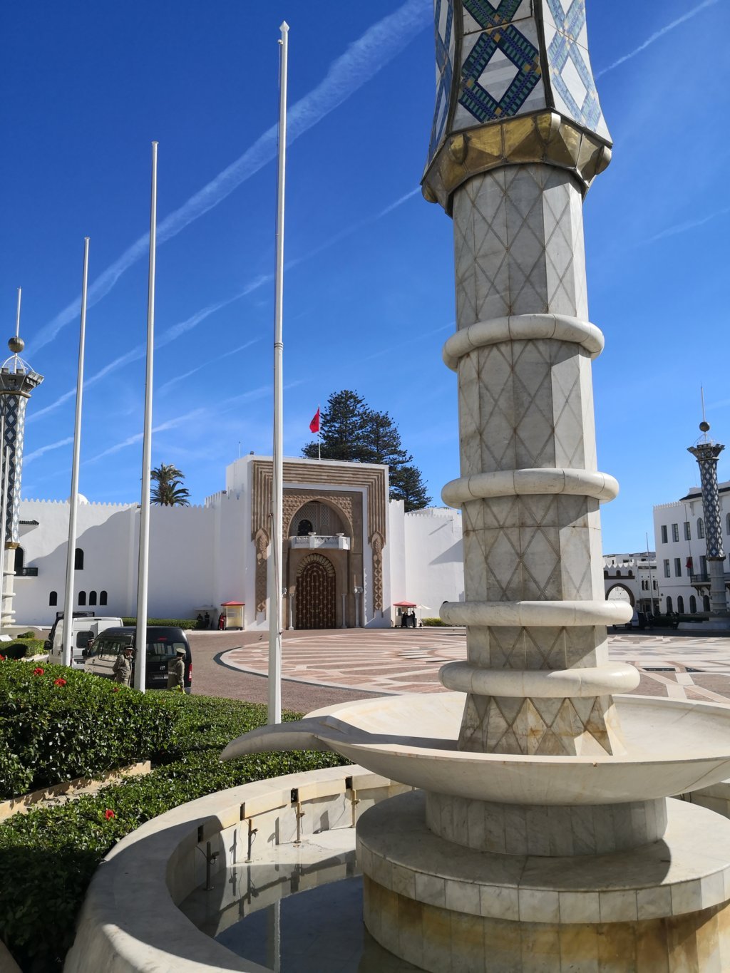 Llegó nuestro guía, que por lo visto no era el inicialmente previsto, un hombre ya de avanzada edad y que sin apenas presentarse comenzó saliendo de la medina donde estaba nuestro riad para enseñarnos otro nuevo palacio del rey, situado en la Plaza Hassan II a la que por cierto no se puede acceder por seguridad. Este palacio del siglo XIX muestra un estilo arquitectónico hispanomusulmán y la verdad que por fuera se ve espectacular.