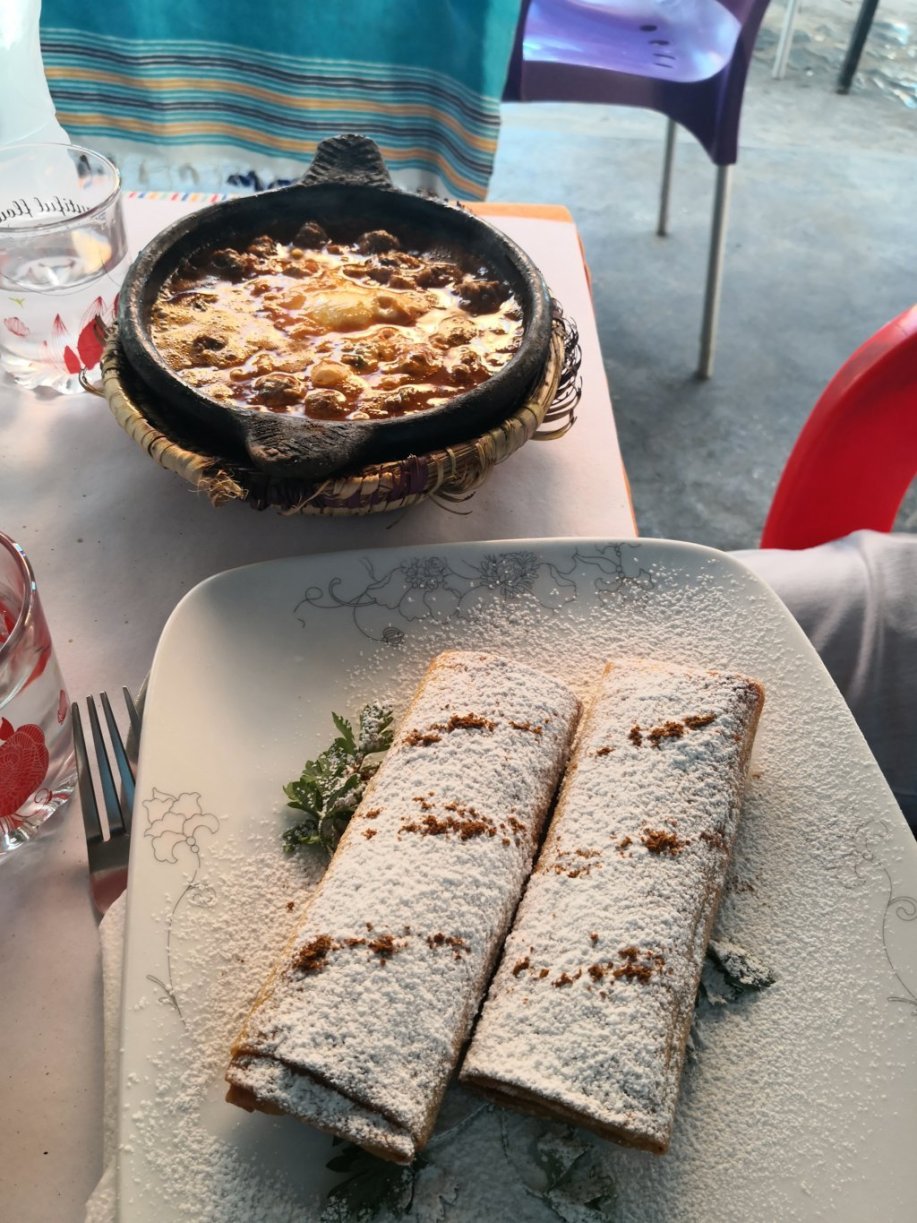 Comimos fenomenal, comida casera 100% como nos confirmó el del hotel. Pedimos 3 tajin kefta más 2 rollitos y 2 pastelas, más bebida y pagamos 373 dh (unos 34€), super bien de precio y de calidad, muy recomendable el sitio.