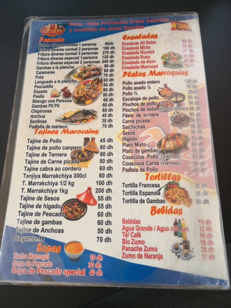 Después de unos 200 kms llegamos a nuestra parada justo a la hora de comer. Daoud nos llevó a un restaurante de barrio, sencillo, se llamaba Ali Baba. Allí, sin grandes pretensiones comimos por poco dinero y la verdad que no estuvo mal. Aquí tenéis la carta en castellano para que os hagáis una idea de lo que ofrece un lugar así, cero turistas, un lugar de barrio.
