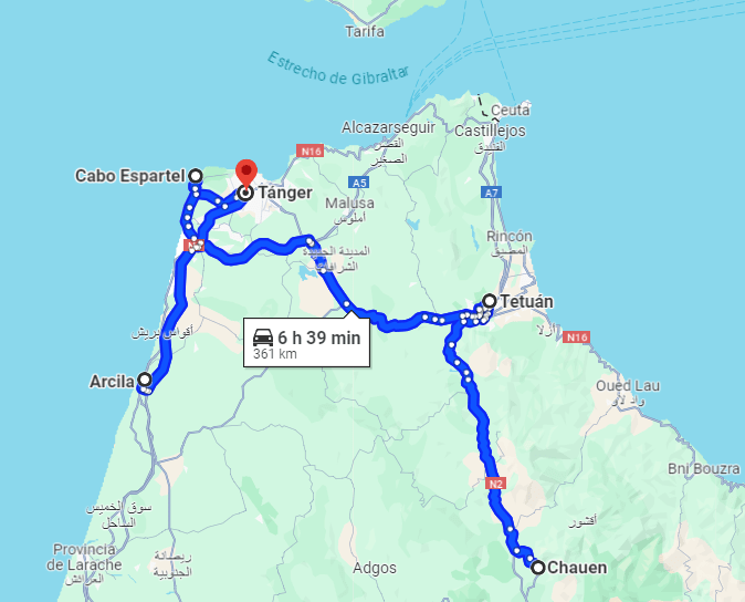 Una vez que dejamos a nuestro acompañante y que Daoud para nuestra sorpresa nos resolvió el misterio diciéndonos que era un policía de incógnito, tomamos rumbo ya hacia nuestro siguiente destino, la singular Chefchaouen, la «Perla Azul» del norte de Marruecos y de las que nos separaban unos 65 kms, sobre 1 hora y 20 minutos.