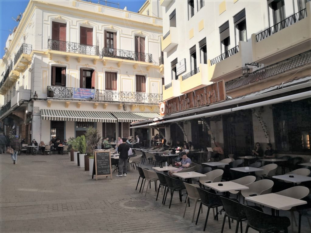 Llegamos a la plaza Moulay El Mehdi, llamada también plaza de Al-Yala, e incluso en época del Protectorado plaza José Antonio Primo de Rivera donde vemos una iglesia católica, Nuestra Señora de las Victorias de 1919, junto al antiguo café de París y el consulado español.