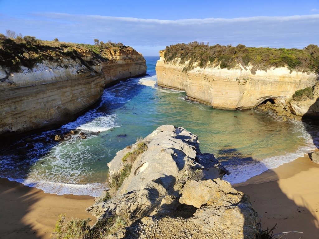 Nuestra primera parada fue un lugar llamado The Grotto al que se accede bajando unas escaleras. Me gustó mucho el entorno de arenisca y el mar golpeando los acantilados.