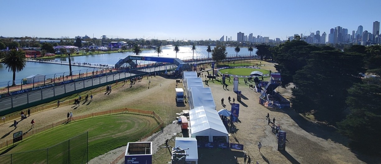 Pero bueno, pudimos ver el ambiente, las diversas atracciones que muestran como coches antiguos, stands de merchandising, exhibiciones, etc. Nos subimos Liria y yo a una pequeña noria gratuita desde que la que pudimos ver esta espectacular perspectiva tanto del circuito como de la ciudad al fondo. Recordemos que esta zona se llama Albert Park, un bonito parque con un lago en medio.
