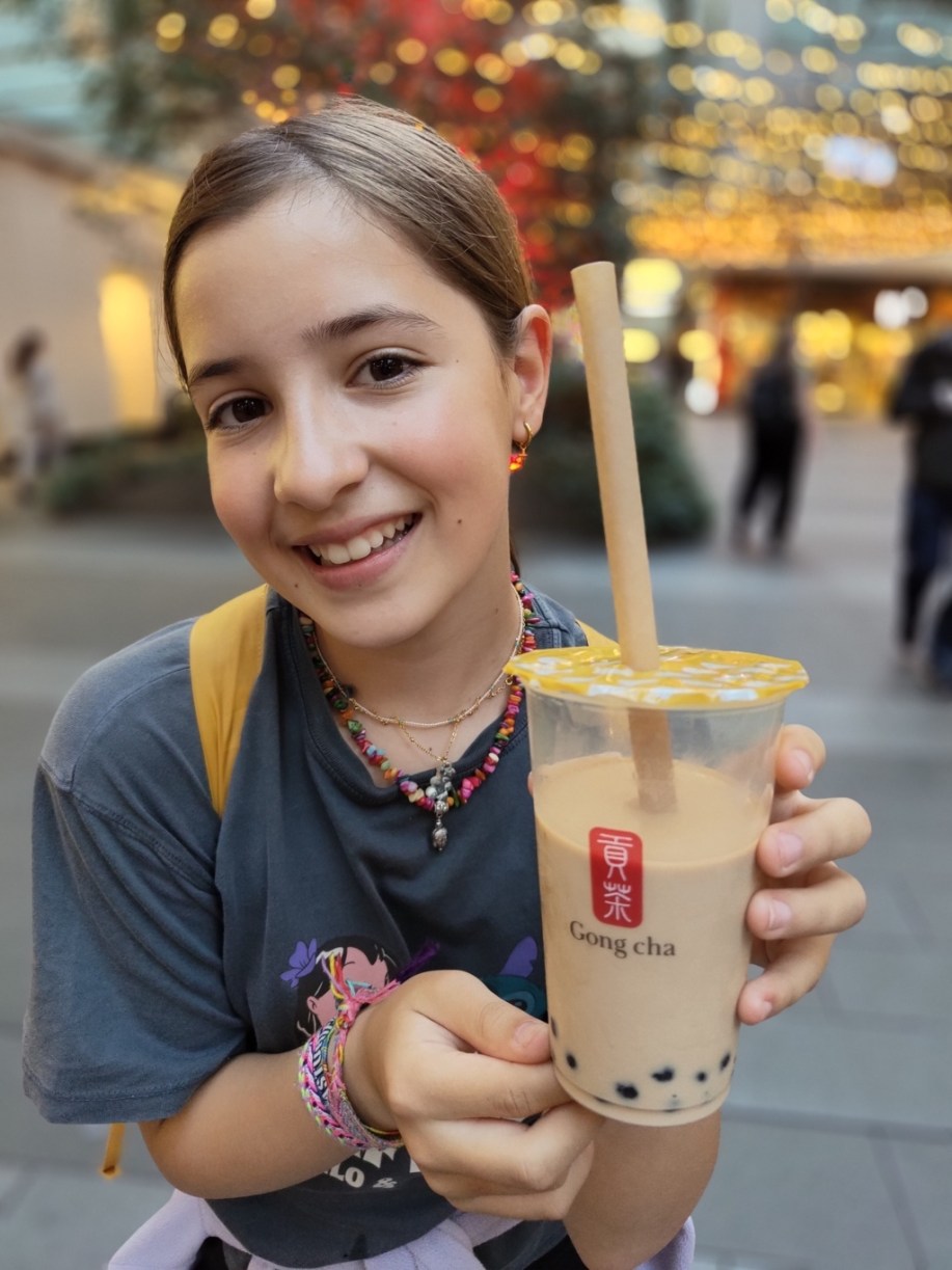 Por consejo de nuestro guía, Liria se atrevió a probar un batido o smoothie en un puesto de la marca Gong cha y que por lo visto se está extendiendo por todo el mundo. Se trata de una compañía china que comenzó su andadura en Taiwan, qué cosas se aprenden en los viajes….