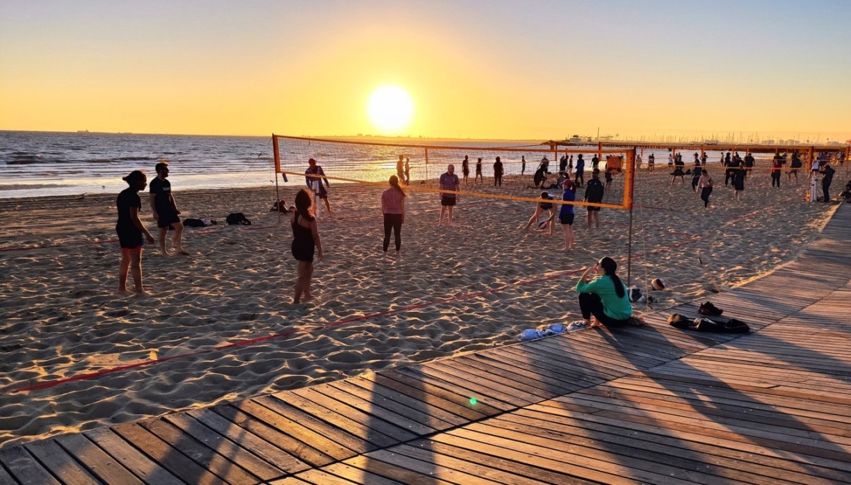 Después del circuito volvimos al coche y nos acercamos a St Kilda Beach. El sol se estaba escondiendo en el horizonte y la playa, aunque hacía algo de viento frío, estaba llena de gente haciendo deportes de todo tipo. Un ambiente de lo más agradable.