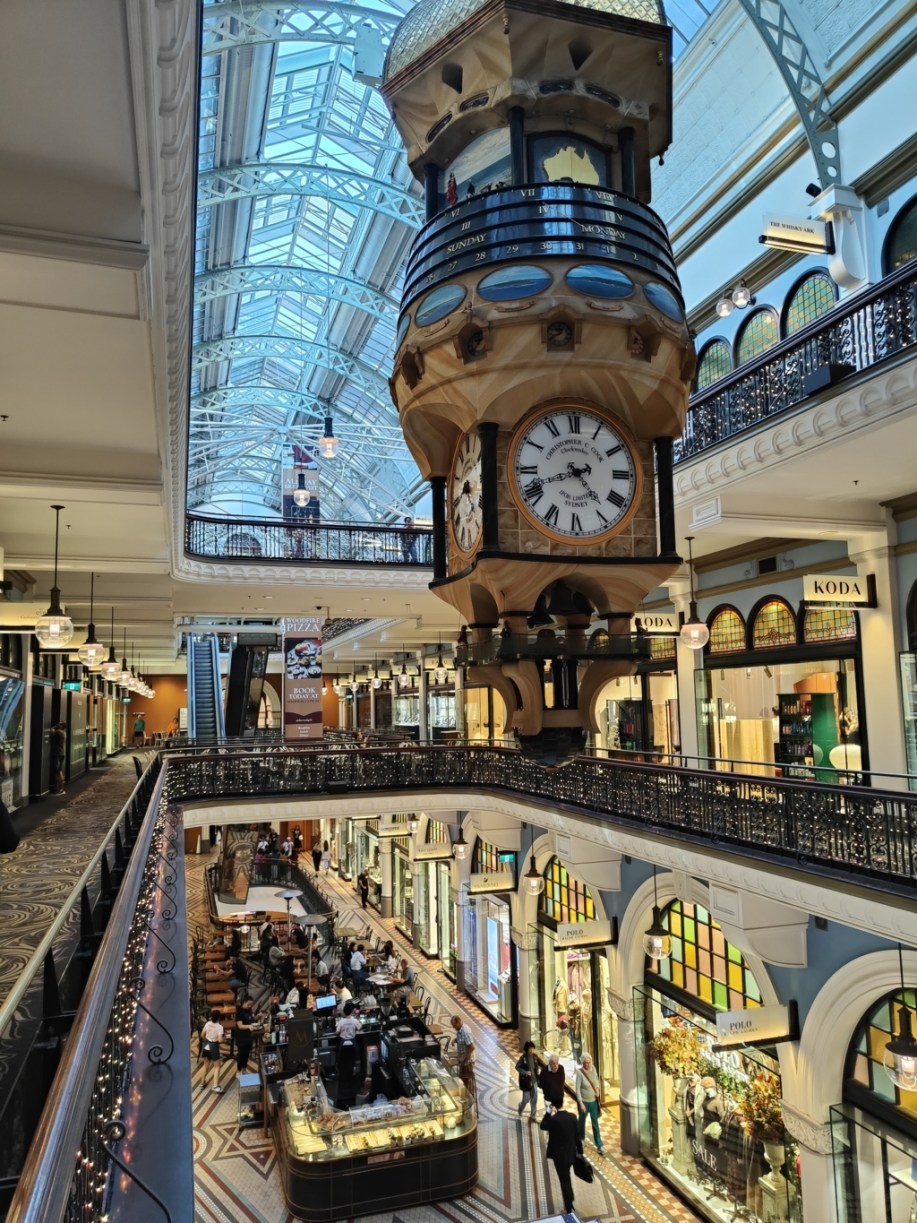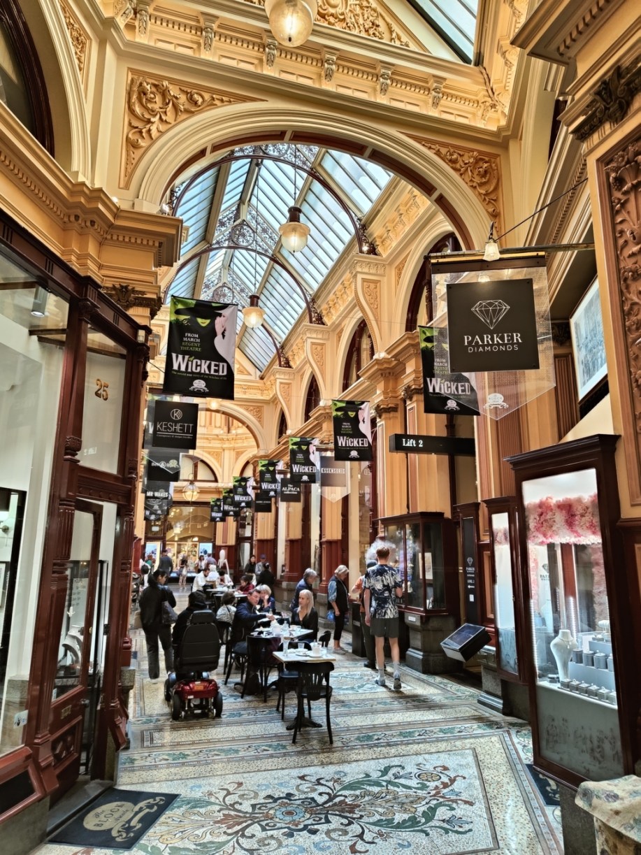 A continuación tocaba ver las dos galerías comerciales más bonitas e interesantes de Melbourne. La primera es Block Arcade, espectacular, situada en Collins Street, ocupa todo un antiguo edificio de estilo victoriano. Entre sus tiendas encontraremos las más famosas firmas de lujo a nivel internacional y las firmas australianas con más reconocimiento en ropa o joyas.