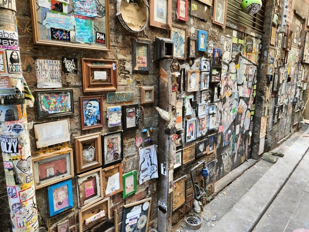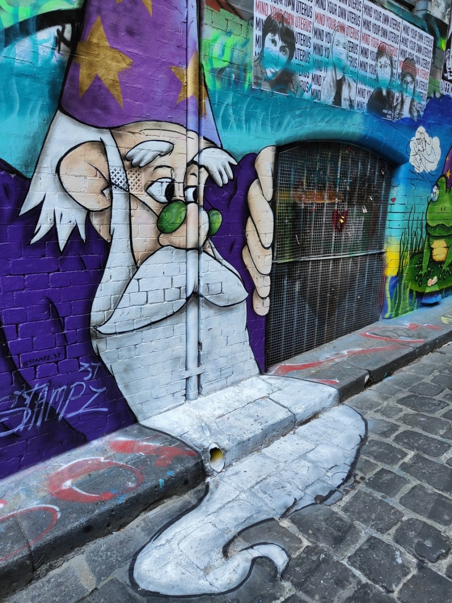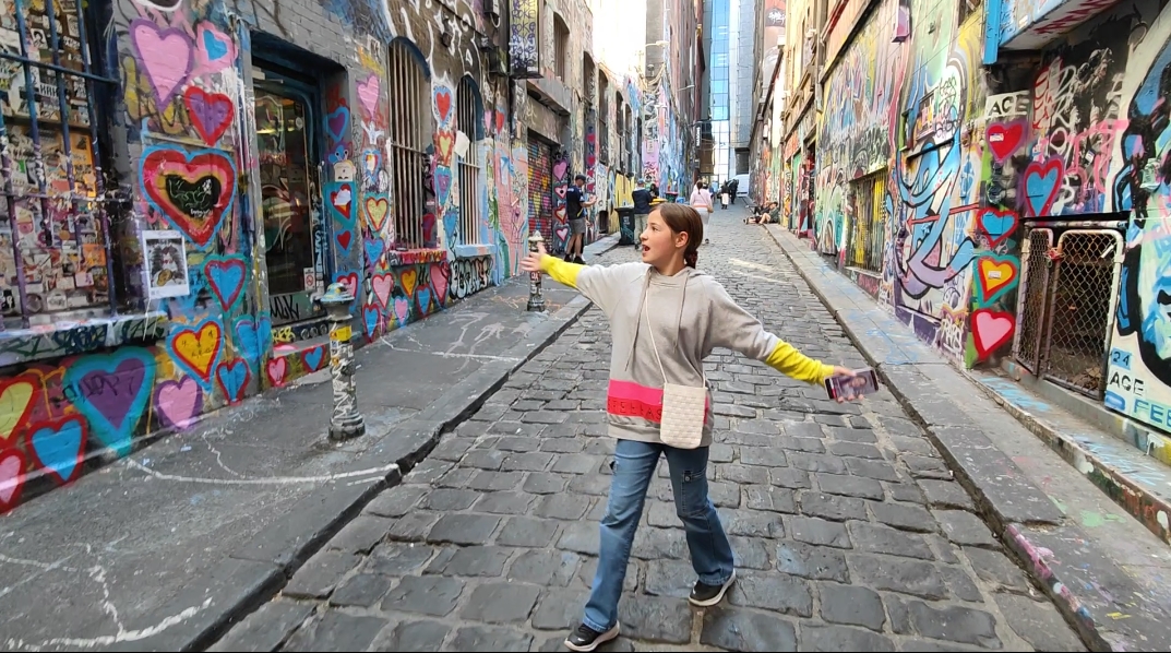 Luego fuimos a descubrir el street Art, una joya de identidad de esta ciudad. Comenzamos quizás con la más famosa, que os presenta Liria 😁, la fantástica Hosier Lane.