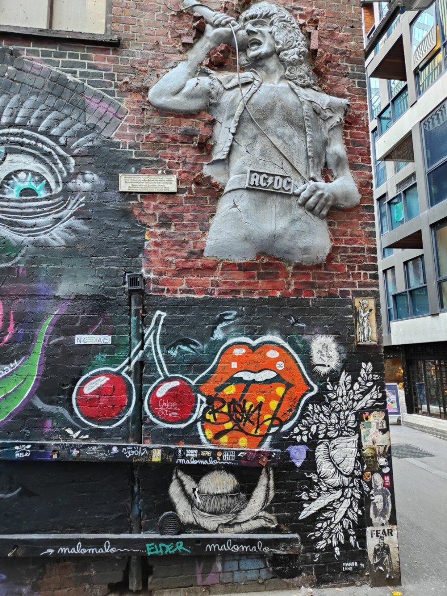 Como no, teníamos que ir a la AC/DC Lane, calle dedicada en 2004 al famosísimo grupo británico-australiano de rock. Curiosamente en ese año, las autoridades hicieron varias copias adicionales de la placa con el nombre previendo que alguien se las llevara de recuerdo.