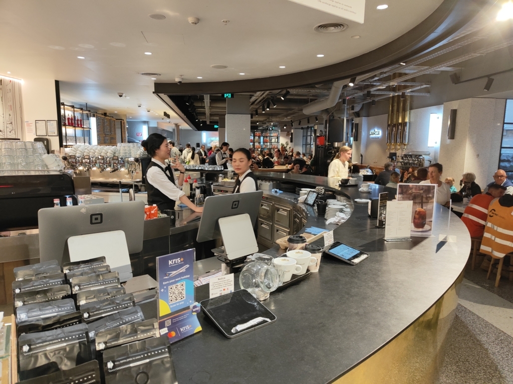 Estaba como no llena de gente, lo cual es habitual según nos comentó una simpática camarera española. Hay multitud de helados, tartas y dulces con una pinta extraordinaria. Pagamos 25.2$ (15€) por dos cafés y dos zumos, me lo esperaba más caro la verdad.