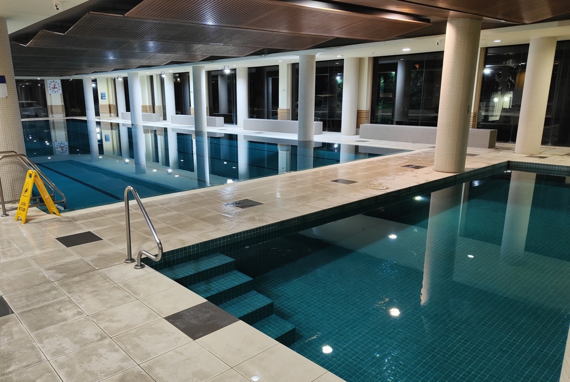 Volvimos al hotel y descubrimos por azar que a los huéspedes se les permitía entrar en un complejo de piscinas en un edificio aledaño, así que para allí que fuimos a relajarnos un poco.