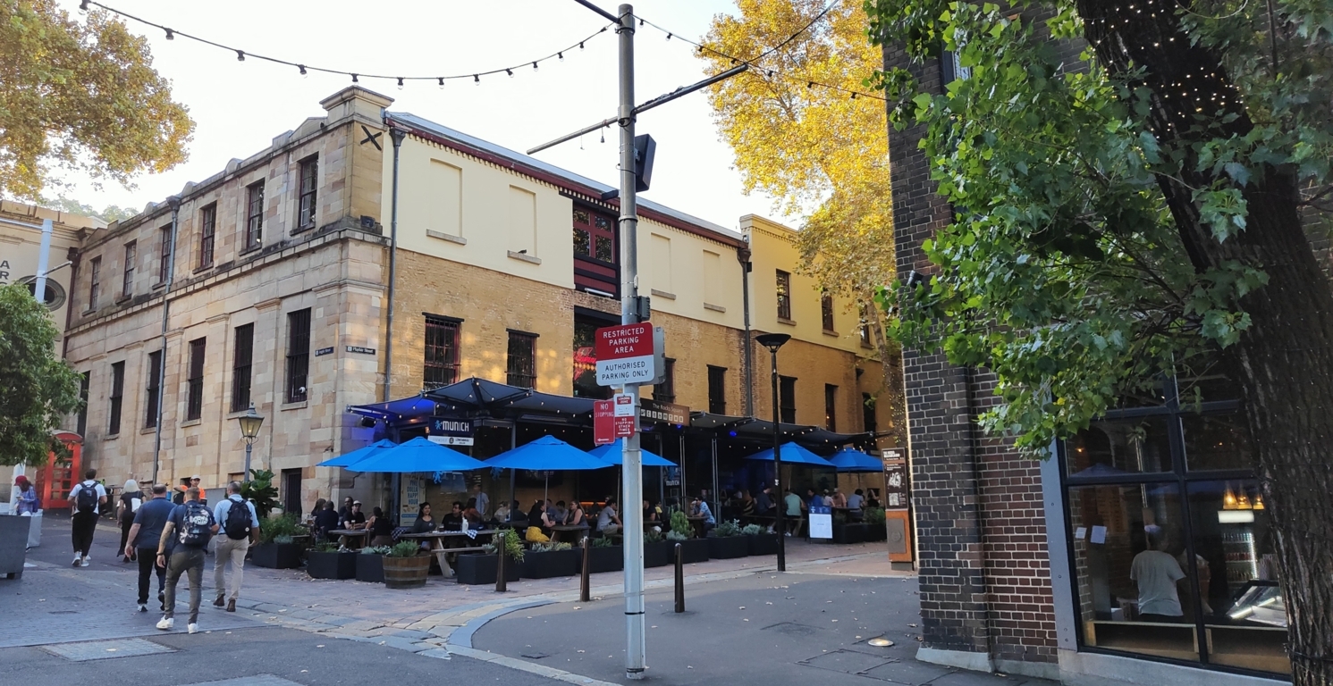Seguimos caminando, vimos el Harbour View Hotel de 1922 y seguimos caminando hacia el barrio The Rocks, el más antiguo de la ciudad. Fue el lugar escogido por los colonos británicos para asentarse y fundar la que hoy es la capital de Nueva Gales del Sur. Las casas bajas y los antiguos almacenes portuarios reconvertidos de ladrillo nos hacen que parezca que estemos en Reino Unido, como me recordaba a Liverpool.