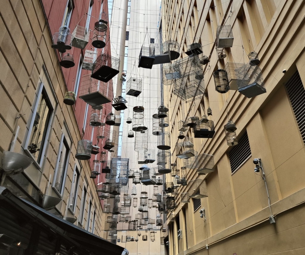 Justo al lado tenéis la Angel Place donde encontraréis una calle muy curiosa con un montón de jaulas vacías colgadas, se trata de una instalación artística conocida como «Forgotten Songs». Por lo visto está hecho en recuerdo de los pájaros que habitaban en la zona antes de la construcción de la ciudad y por la tarde incluso se activan sonidos de los mismos para recordarlos.