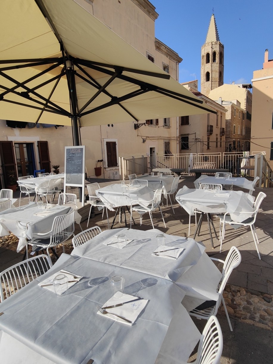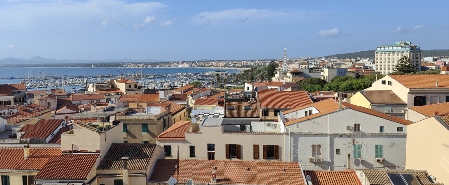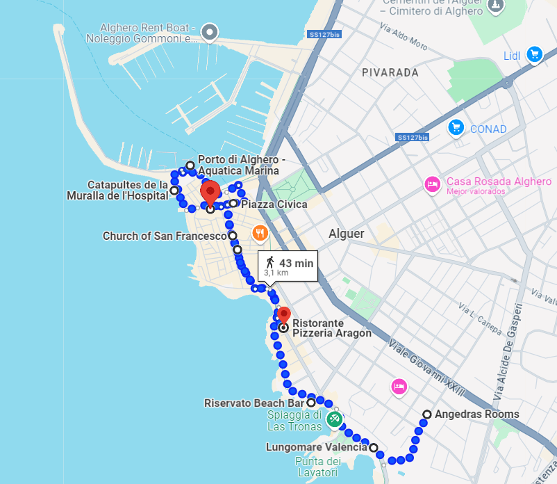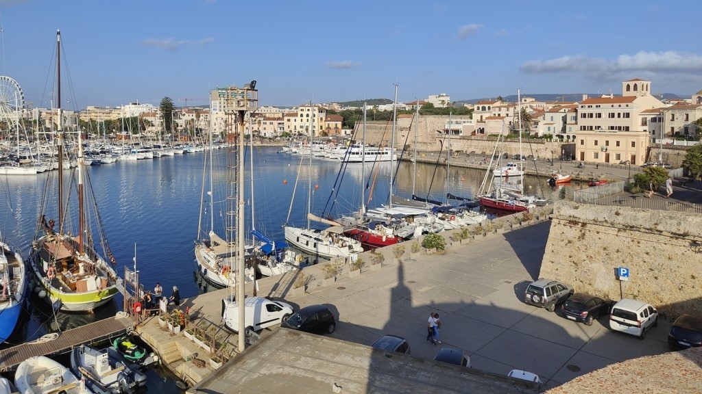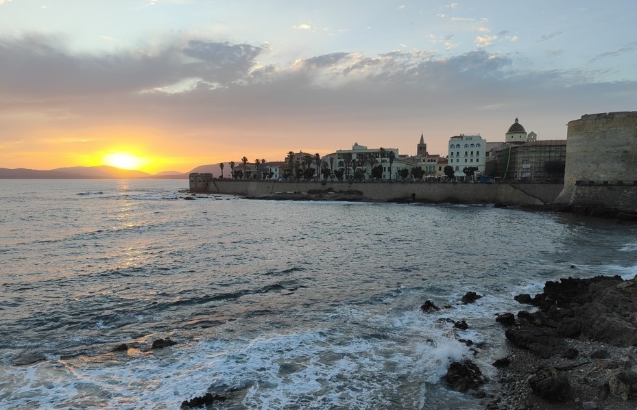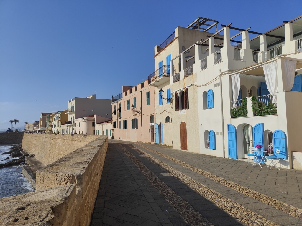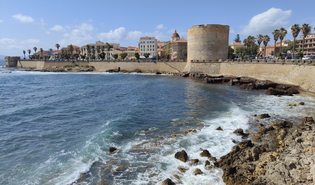 Seguimos caminando a lo largo de la costa hacia el centro de Alghero, localidad pesquera de unos 44,000 habitantes (2023) protegida por una muralla y siete torres del s. XV. Fundada en el siglo XII como ciudad fortaleza por los genoveses, sufrió el dominio aragonés que influyó en su arte y tradiciones. Aquí podéis ver una buena muestra de su muralla y una de sus torres, esta llamada del Espero Real.