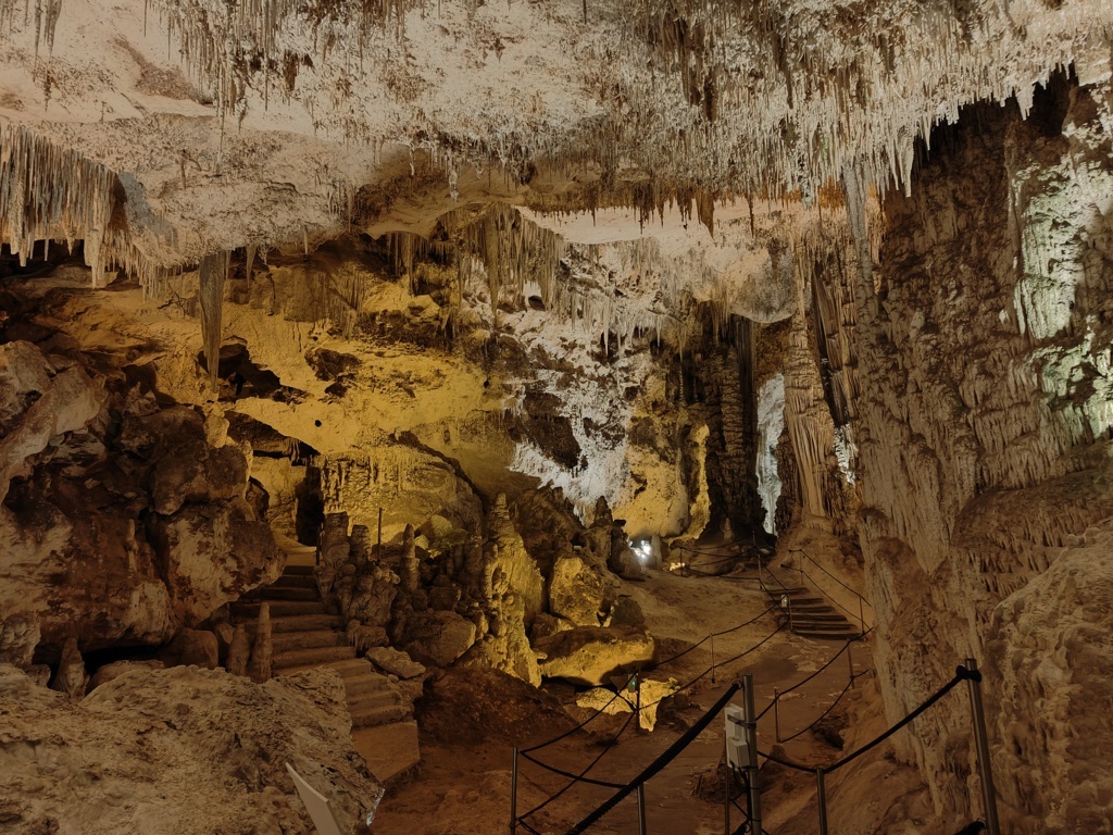 Por la cueva discurre un rio subterráneo que corre por distintas salas y que muestran la belleza de la que es capaz la naturaleza solo con la unión del agua y las sales minerales. Impresionan las salas que visitamos, que además con el ruido del mar al fondo la hacen muy especial. Es la primera vez en mi vida que visito una cueva al borde del mar de estas características y todos coincidimos en que nos gustó mucho.