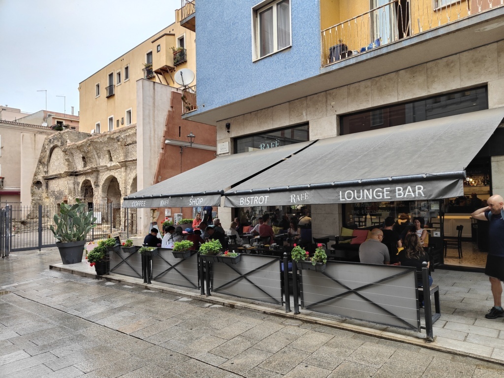 Tuvimos que buscar un poco porque no encontrábamos bares abiertos a esa hora (sobre las 9 y media) hasta que finalmente nos topamos con uno llamado Rafè coffee & shop e bistrot. Como indico arriba era domingo y además llovía un poco, así que se levantó el día no muy agradable.